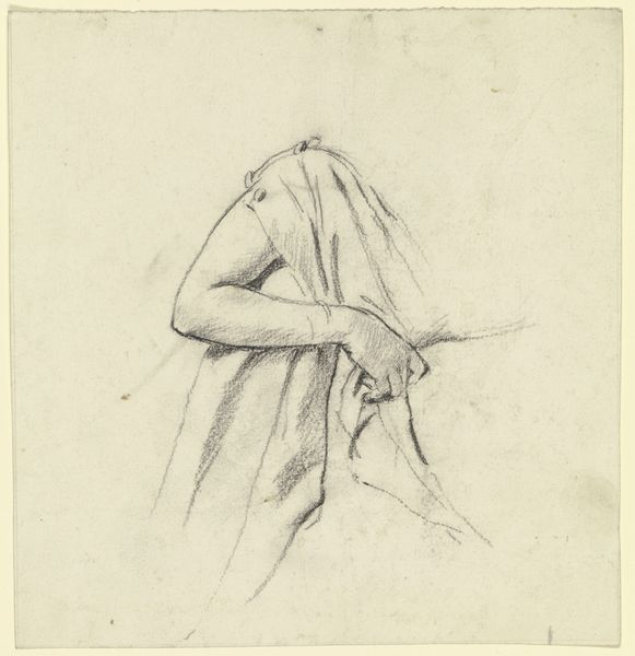 Curator: What a fascinating sketch. The Städel Museum holds this piece titled "Skirt of a standing woman," rendered in pencil and chalk by Victor Müller. Editor: Intriguing! My first impression is all about the play of light. The drapery almost seems to glow against the paper. There's a wonderful dynamism created by the strong, contrasting lines. Curator: It’s intriguing, isn’t it? Given Müller's prominence during a period of burgeoning bourgeois culture, studies such as this hint at the rising emphasis on fashion and societal presentation. Consider the skirt as more than fabric but a silent statement within that social theater. Editor: Absolutely! The linear composition also draws me in. It's not merely representational; the sharp changes in tone and the deliberate weight of the lines, especially at the base, imbue the skirt with an almost monumental presence. The absence of the rest of the figure is particularly thought-provoking from a purely formal standpoint. Curator: It does prompt many questions, especially about Müller’s intent. Was it a quick study for a larger composition, a social commentary through sartorial detail, or a reflection of the period's focus on defining and refining the female silhouette? There are endless questions. Editor: Right. And speaking of reflection, observe how the interplay of hatched lines and smudged chalk creates both volume and transparency. The artist teases us—it feels like we could reach out and touch the fabric. There’s an evocative quality in its abstract realism that is compelling. Curator: Yes, and his mastery hints at his awareness of presenting and representing femininity in 19th century Europe. We’re seeing both the structure and perhaps some of the era’s constructs regarding how women presented themselves, quite literally cloaked in fabric. Editor: A poignant dialogue, skillfully captured, between line, form, and societal construct then. It reminds us how technique, in skilled hands, can open narratives far beyond the immediately visible. Curator: Exactly, it reminds us that art and social norms evolve together, influencing the perception and reflection on display within cultural works like this sketch.