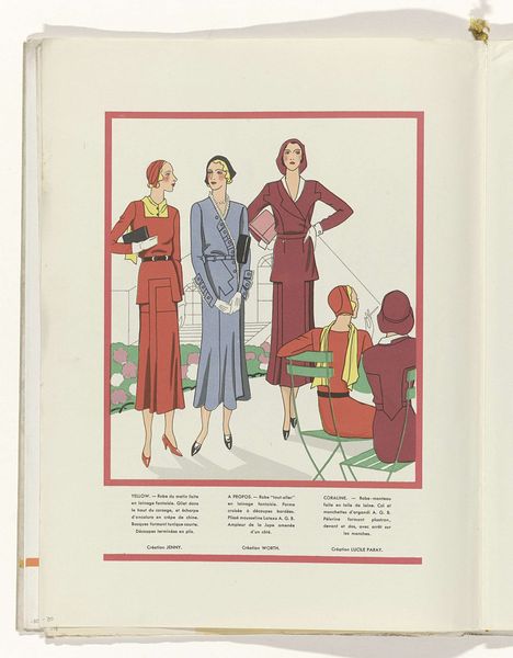 Curator: Here we have R. Drivon’s “Art - Goût - Beauté, Feuillets de l'Élégance Féminine, Mars 1932, No. 139, 12e Année, p. 11”, created in 1932. It’s a drawing reproduced as a print, incorporating both pen and traditional media techniques. Editor: Oh, I love this! It feels like stepping into a glamorous film still. There's a restrained energy, all poised elegance and knowing glances. It makes me want a cigarette holder and a silk gown! Curator: Indeed. Note the deliberate composition, how each figure’s placement contributes to an overall sense of linear rhythm. The interplay of geometric shapes—the rounded hats, the rectangular fabrics—against the organic forms of the figures creates visual harmony, don't you agree? Editor: Absolutely! And the color palette... muted tones with strategic pops. That dusty rose against the earthier browns is just perfect. It gives them this otherworldly feel, almost like figures from a dream. There is some writing too, but too small for me to discern at this resolution. Curator: It’s a conscious invocation of Art Deco aesthetics: idealized forms rendered with graphic precision. The stylized presentation reinforces fashion as a cultural construct, divorced from reality. We see form prioritized over individual character, wouldn’t you say? Editor: Perhaps... But there’s still something human in those poses, a hint of attitude, maybe even a bit of mischief! And fashion isn't really divorced from reality: It’s a projection, a feeling... What is possible! Curator: A valid point. Ultimately, Drivon captures the spirit of an era: one seeking beauty in form, even as society hurtled towards transformation. Editor: I know what you mean. This piece makes you wonder what life was really like then – both on display and behind the curtain! Curator: A piece where form elevates the everyday. Editor: To the world of dreams.