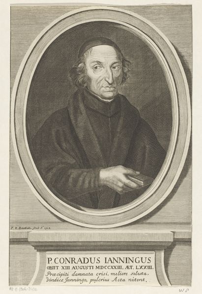 This engraving of Pierre Dupuy was created by Robert Nanteuil, sometime in the 17th century. The portrait is striking for its formal arrangement and intricate detail. Dupuy’s figure is framed by an oval border, set against a backdrop of fine, parallel lines that create a subtle depth. The artist's masterful control of line is evident in the delicate rendering of Dupuy’s features and the texture of his garments. Nanteuil’s emphasis on line and form reflects the period's interest in clarity and order, echoing philosophical concerns with rationalism and the pursuit of knowledge. Semiotically, the lines function as signs pointing to structure, which in this case suggests not just the physical form of Dupuy, but a structural, societal role. Note the heraldic symbols beneath the portrait. These do not merely signify identity, but engage with semiotic systems of power and social status. Through his strategic deployment of visual elements, Nanteuil invites us to consider how portraiture serves not just as a representation, but as a complex interplay of form, identity, and meaning.