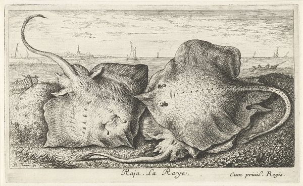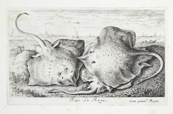 Albert Flamen made this print of two flounders on the beach using etching, sometime in the 17th century. With etching, an artist covers a metal plate with a waxy, acid-resistant ground, then scratches an image into that ground. When the plate is bathed in acid, the exposed lines are eaten away, leaving an impression that can be inked and printed. The resulting image can vary from thin and delicate, to deep and expressive, according to the duration and strength of the acid bath. Here, Flamen expertly uses the etching process to describe the texture and form of the fish. Note the tiny lines that create the illusion of their scales, and the precise rendering of their fins. The print captures the stark reality of the day’s catch, a reminder of the labor involved in bringing food to market. These flounders, freshly caught, are presented not just as objects of still life, but as symbols of human effort and the rewards of working on the water.