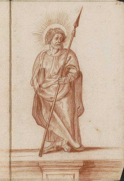 Editor: This is Marcantonio Raimondi's engraving of "Apostle Judas Thaddeus with Halberd," created sometime between 1517 and 1527. There's a stillness and serenity about him that I find quite compelling, even though he's holding what looks like a weapon. How would you interpret the symbolism at play here? Curator: Notice how the halberd isn't just a weapon. It’s an attribute, a visual signifier connected specifically to Judas Thaddeus. The cultural memory encoded in that weapon reminds us of his martyrdom; the saw is another, more common attribute, though this is a halberd, a poleaxe. Consider how the Renaissance artists aimed to create recognizable symbolic language. What feelings does it evoke knowing this seemingly gentle figure meets a violent end? Editor: That makes sense. So, the weapon isn’t just about violence but also about remembering a specific story and the saint's identity. It gives the image much greater depth and complexity. Is that what the halo signifies too, as a shared understanding of holiness? Curator: Exactly! The halo immediately codes the figure as holy, but the added inscription "S. Iudas Thaddeus," clarifies it. Even without knowing who Judas Thaddeus was, viewers could decode some basic meanings using universally understood Christian iconographic cues. Think about how those symbols acted as memory aids in a pre-literate society. Editor: It's fascinating to see how much information could be packed into a single image using these visual symbols. So the artists didn't merely create a picture; they were transmitting stories, faith, and historical context to viewers who may not be able to read? Curator: Precisely! These visual elements weren't just aesthetic choices; they served to transmit essential religious, moral, and cultural information. Understanding this unlocks whole layers of interpretation and meaning that make art from the Italian Renaissance like Raimondi's especially potent. Editor: This really has me rethinking how to approach understanding earlier art! It’s about decoding cultural information encoded through visual representation. Curator: I'm glad! It means recognizing that a simple image can carry entire narratives and cultural touchstones within its forms and figures, enriching our own understanding of the past.