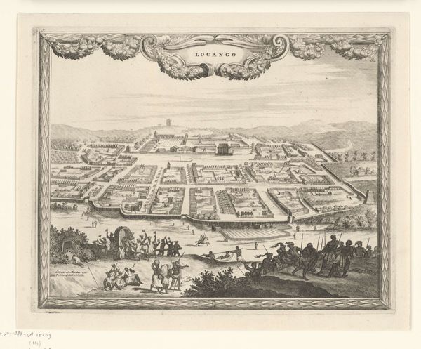 Curator: Looking at this engraving from around the turn of the 18th century, "Gezicht op Paleis Het Loo," one is immediately struck by its sense of calculated grandeur. Editor: Indeed, the composition exudes a specific sort of planned control. One gets the feeling the people included are mere decorations rather than subjects who enjoy access to power. Curator: Quite. The engraving depicts Het Loo Palace, near Apeldoorn, during the reign of William III, King of England and Stadtholder of the Dutch Republic. Its symmetrical gardens, the vast grounds, and the almost bird's-eye perspective, were common approaches in Baroque depictions of power and status. Editor: Thinking of who William represented, one has to view this art in light of colonial activities funded and supported by his governance, both in England and in the Dutch Republic. In what way do you think this kind of grand statement attempts to elide some of the brutality that paid for it? Curator: That’s a crucial perspective. These visual statements often sought to legitimize power, distracting from underlying issues by emphasizing opulence and order. In this artwork we witness William and his court front and center, very similar to portraits by Van Dyck showing Charles I of England at his ease while the lower classes were oppressed, as a blatant justification for their rule and access to lands they controlled and pillaged around the world. Editor: So this print becomes a kind of record—of what those in power *wanted* to be believed at the time, an official history crafted through images that conveniently omits the voices of the marginalized. How fascinating to have such explicit visual strategies! Curator: Precisely! Examining the relationship between art and social history reveals so much about not just the period when something was created, but about art's ability to frame sociopolitical ideology through different media for an enduring legacy. Editor: Absolutely, by analyzing the socio-political undertones of works like "Gezicht op Paleis Het Loo", we create pathways to unearth silenced perspectives, and ultimately enrich the narrative, ensuring that historical awareness stays vigilant.