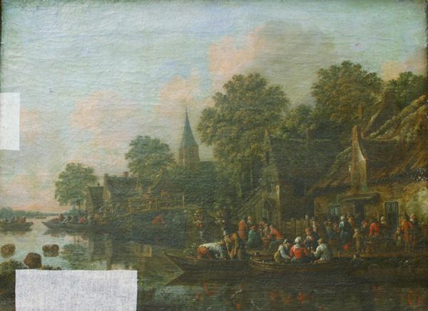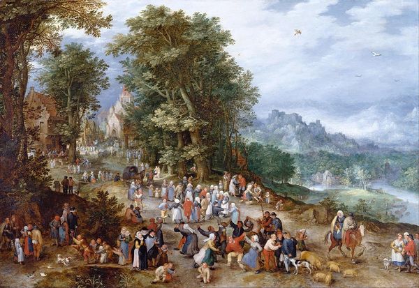 Editor: Here we have Jan Brueghel the Elder’s "Village Kermis in Schelle with Self Portrait," an oil painting from 1613. I’m immediately struck by how detailed the composition is. The artist has packed so much activity into this one scene, but maintains clarity throughout the whole of the work. How do you interpret the relationship between all these different sections? Curator: Let's first appreciate how Brueghel utilizes the high horizon line and aerial perspective to compress a tremendous amount of information within a single pictorial plane. It yields a reading where discrete segments coexist, creating a dialogue among form, color, and space. Do you notice the mirroring in the water of the tall church and buildings on the shore opposite? What does this visual strategy suggest about the relationships depicted within the painting? Editor: I see the way that buildings are mirrored. The reflection adds to the intricacy and visual play in the painting. Perhaps this technique mirrors how the various elements reflect and complement each other, showing the connectivity of community? Curator: Precisely. Note further how the textures change throughout. Close observation suggests a careful deliberation and conscious shift from a macro level of detail to micro brushstrokes to depict space as it extends from foreground to background. How is color employed here to serve that effect? Editor: The colours definitely get more muted with distance! He’s using brighter colours in the foreground where all the action is, drawing my eye. Curator: Indeed. That layering is intentional. We can then explore what it communicates about the structuring elements of baroque paintings. Thank you. I notice new relationships every time I truly *see* the painting. Editor: I completely agree. I thought it was a nice snapshot of a village fair, but it’s a meticulously designed interplay of form and color.
