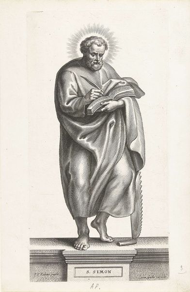 Petrus Clouwet created this depiction of Heilige Judas Taddeüs, or Saint Jude Thaddeus, through engraving, a printmaking technique. The image is made by incising lines onto a metal plate, inking the plate, and then pressing it onto paper. Look closely, and you'll notice how the density of the lines creates the illusion of shadow and form. The varying widths and depths of the lines are crucial, each one carefully carved to give the image its texture and tone. Consider the labor-intensive process of engraving. It requires both skill and time, reflecting a tradition deeply rooted in craft. The clean lines of the engraving give a sense of precision and clarity. The choice of this medium speaks to the social context of the time, where printmaking was an important method for disseminating images and ideas. By appreciating the skill involved in this engraving, we can move beyond traditional notions of fine art, recognizing the value and significance of the crafts.