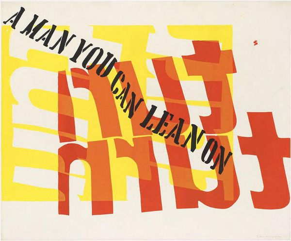 Curator: Corita Kent's vibrant screen print, "(our best) reality proves very little," explodes with color and typographic energy. Editor: It's like a visual shout! The bold letters and shapes create a feeling of playful defiance, almost mocking certainty. Curator: Kent's work often combines text and image, drawing inspiration from pop culture, theology, and social justice. See how the fragmented words invite contemplation. Editor: Absolutely, the layering and juxtaposition of colors and letterforms disrupt traditional reading. It's a deconstruction of language itself. The handwritten text within the blue circle adds another layer, like a personal annotation. Curator: It echoes her teaching philosophy, emphasizing intuition and questioning established norms. "Reality proves very little," indeed, questioning our assumptions of knowledge and certainty. Editor: It's a powerful statement, really. It pushes us to embrace ambiguity and to value our own experiences, rather than relying on fixed ideas. This print leaves me buzzing with questions.