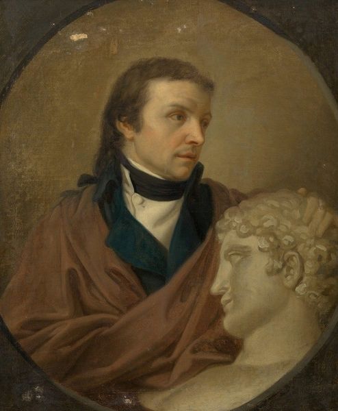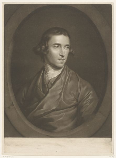 Editor: This portrait, "Richard Cumberland the Dramatist" by George Romney, feels very contemplative. His gaze is directed away, almost as if he’s in deep thought. What do you see in this piece? Curator: Notice how Romney renders Cumberland’s gaze averted, almost prophetic. The averted gaze invites us to consider interiority, hinting at a world of thought and creativity beyond the surface. What cultural assumptions are reinforced through this pose? Editor: It suggests he’s a visionary, someone inspired. Curator: Precisely. In Romney’s time, associating creative genius with a faraway look contributed to the mythos surrounding artists and intellectuals. It also perpetuates a certain detachment from the everyday. Editor: It's fascinating how a simple pose can carry so much meaning. Curator: Indeed. It reminds us that images speak volumes about cultural memory and the values we project onto figures of importance.