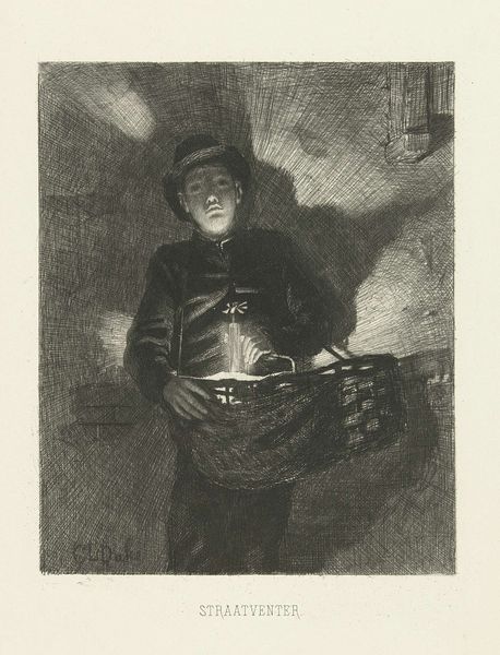 Curator: Ah, this is "Mandenmaker" by Carel Adolph Lion Cachet. He probably made it somewhere between 1874 and 1945. It's here at the Rijksmuseum. Editor: There’s such a stillness in this charcoal drawing. The gray tones and somber mood almost evoke the quiet solitude of creation itself. Curator: Absolutely! It captures a moment of focused labor. Cachet seems to explore not just *who* this basket maker is, but how he occupies his space, almost blurring the line between figure and background, right? Editor: Indeed! Look closely. Notice how Cachet uses charcoal? The lines are direct, economical. He is deeply attentive to how labor shapes both object and identity. The textures really come to life as light dances across woven surfaces! Curator: And consider the social implications here! It’s not just about art, it’s also about a means of living and a place within a community! A reminder, maybe, to appreciate objects handcrafted through time. Editor: Craft is such an intimate process, wouldn't you say? And charcoal serves beautifully to trace that labor! This reminds me how all objects we consume carry someone’s effort and tell their story. Curator: Absolutely. There’s a certain reverence in the way Cachet renders this man, wouldn't you agree? There’s grace within the ordinary and a humble kind of mastery. Editor: The entire composition, from the hat on his head to the object in his lap, focuses your attention on production. In those actions there are stories embedded for each maker, connecting the personal with broader cultural landscapes. Curator: It leaves us reflecting upon how Cachet highlights the value found within simple craftsmanship. What seems commonplace transforms into something exceptional. It brings up larger thoughts around economy and resilience. Editor: To know labor—whether our own or others'—changes how we see the world around us. Thank you for highlighting that hidden truth, I find that perspective both refreshing and necessary.