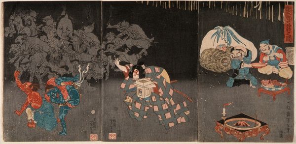 Editor: This is "Twee acteurs tussen vlammen en rook", or "Two Actors Amid Flames and Smoke," by Utagawa Yoshitaki, made around 1862. It's a woodblock print, and the scene feels intensely dramatic. All that dark background really amplifies the costumes and the actors' expressions. What can you tell me about what's happening here? Curator: Well, beyond the visual drama, it’s important to consider Utagawa Yoshitaki’s role within the Osaka printmaking scene. Prints like these were hugely popular entertainment. Kabuki theater was the pop culture of its day, and these prints served almost as promotional material and celebrity endorsements. Notice how the exaggerated poses and facial expressions speak to the performance style. Editor: So, these prints were essentially capturing moments from famous plays? Is that why the characters seem so...expressive? Curator: Precisely. The artist isn’t just creating a portrait, he’s participating in and shaping the celebrity culture around Kabuki. What does the imagery, like the flames and maybe water motifs at the bottom of the frame, communicate to you? Do you recognize specific tropes, or characters from Japanese Kabuki tradition? Editor: I see now! So it is more than just the record of what was shown. Those prints also helped build and sustain excitement and gave audience ways of identifying heroes and other Kabuki archetypes of the era. I definitely feel like I understand these kinds of images a bit more, in relation to society at large. Curator: And hopefully understand how something seemingly “decorative” like a print, has much more to say about society.