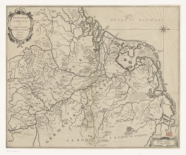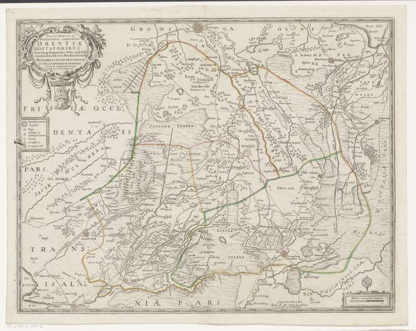 Editor: Here we have a rather fascinating map entitled "Kaart van het prinsbisdom Luik," dating from somewhere between 1635 and 1696. It’s an engraving currently held at the Rijksmuseum. The detail is amazing! It feels very much of its time, but still conveys a lot of information. What strikes you most when you look at it? Curator: The image carries a powerful weight of cultural memory. Consider how maps, even now, define territories, solidify power, and shape identity. Back then, this map wouldn’t just be geographical; it’s a statement of dominion. Look at the carefully rendered settlements and topography; how does that strike you? Editor: It’s interesting that everything seems equally emphasized. There isn't a clear focal point as you might find in a modern map designed for navigation. Everything appears very deliberate and strategic. Curator: Precisely. It emphasizes possession. Maps are coded with meaning and authority; consider the heraldry in the cartouche, visually legitimizing the power structure of the prince-bishopric of Liège. It evokes permanence. Are there elements that speak to ideas beyond geographic data? Editor: Definitely. The flowing lines, almost artistic flourishes in the rivers and hills. The map also contains old language with difficult spelling, representing an era gone by. It almost feels like a time capsule of that era’s identity. Curator: Exactly. It uses those flourishes to suggest stability, beauty, and, yes, a lasting legacy. Remember, images speak louder than words sometimes. This isn’t just where things are. It’s who claims them, and for how long. Editor: That’s such a good point. It is a form of visual claim, isn't it? A permanent inscription of power on a piece of paper. Thank you for expanding my views of it.