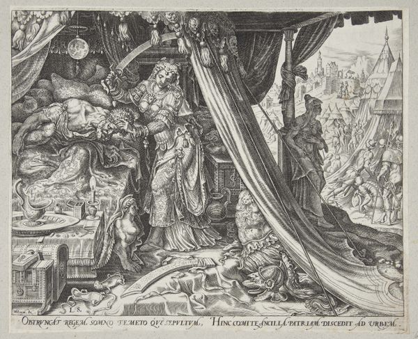 Curator: Let's consider this engraving, "Tamar brought to execution, showing Judah's pledge" made by Harmen Jansz. Muller between 1564 and 1567. Editor: Thanks! The intricacy of the lines creating this somber historical scene is really striking. The sheer density of figures in such a small space! What can you tell me about its visual composition? Curator: Observe how Muller uses dense, parallel lines to generate tonal variation and a sense of depth. Note also the dynamic tension established by the strong diagonal formed by Tamar being lead towards the pyre juxtaposed with the group observing from the rear. The very precise lines describe forms but also evoke emotional intensity. Editor: The dramatic diagonal is so effective. The whole scene is rendered in such detail - it makes you wonder what is he trying to draw the viewer's eye toward? Curator: Precisely. Ask yourself what structural purpose do they fulfill? Is it merely illustrative, or do those stylistic decisions influence the image's message? Semiotically speaking, we see several sets of hands with distinct purposes which function almost like notations. Consider the tension arising from how figures are brought together as part of this historical drama versus where they sit relative to the execution being readied, namely inside the frame versus outside the action. Editor: I see that distinction now; thank you! There’s an active group preparing the fire contrasted by the more contemplative assembly of figures with Judah holding the proof of Tamar’s claims. The composition mirrors the narrative. Curator: Exactly. So how do you interpret the relation between subject and form now? Editor: Considering the emphasis on formal relationships within the work, I appreciate the connection between Muller's technique and the story being conveyed. It becomes clear how the choices of composition influence the viewer's perception and reaction. Curator: Indeed. And how through these choices the artist allows the viewer an engagement that is both aesthetic and intellectual.