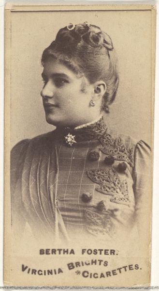 This is a promotional card for Cross Cut Cigarettes, issued by Duke Sons & Co. sometime between 1870 and 1920. The card, made through industrial printing techniques, features an image of Mrs. Cleveland, likely aimed to add an aura of sophistication to the brand. The card's surface is smooth, a result of the printing process that allowed for mass production and distribution. This contrasts with unique artworks, highlighting the shift towards consumer culture during this period. The photographic image, once a novelty, now serves commercial purposes, blurring the lines between art and advertising. Consider the labor involved in producing these cards on a massive scale, from cultivating the tobacco to printing the images. It offers a glimpse into the social dynamics of the late 19th century, where industrialization and marketing intersected, shaping both consumer habits and cultural values. This card demonstrates how everyday objects can reflect broader economic and social transformations.