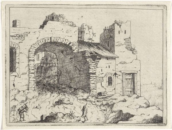 Curator: Welcome. Here we have a work entitled "Huis te midden van een muur met kantelen" – or "House amid a wall with battlements" – an engraving by M. Schaep, dating from 1648. Editor: It evokes a sense of ruin, but almost a romanticized one. Look at the details, the jagged edges of the wall and the solidity of the dark stones, creating a study of resilience, but also deep social shifts. Curator: Indeed. Schaep was working during a period when the Dutch Republic was consolidating its power. These images of fortified structures were often imbued with the political symbolism of the state and the role of its citizens. The detailed linework does reflect an attempt at realism, capturing architectural specifics alongside the softer suggestion of ruin. Editor: I can't help but feel a tension between that realism and what the 'ruin' stands for – particularly at this time. Was it really an assertion of strength, or perhaps a gentle acknowledgement of the impact of violence and neglect over time, both on buildings and communities? And is this a scene viewed through a male or female gaze, with its power dynamics? Curator: That's a compelling reading. I think it's vital to remember that these cityscapes weren't neutral depictions, but powerful vehicles of identity and authority. Note the composition – how the house nestled within the walls creates a visual narrative of shelter and control, but also restriction. The social context suggests not simply beauty but complex messaging of social spaces and power. Editor: The cityscape theme seems almost nostalgic. You see signs of nature – clinging foliage—that reminds you of life growing through historical fissures. What seems like just an illustration becomes, through your insight, a reflection on identity. Curator: I’m so glad you picked up on that, as it brings to mind its lasting impact in our museum collections – we continue to interact and give meaning to this piece through social and cultural shifts. Editor: Right, that invites us to continuously ask: what is this ruin today, what space it occupies for a community within contemporary landscapes of power, both visible and invisible. It encourages us to reframe the very ways that social and political power gets interpreted.