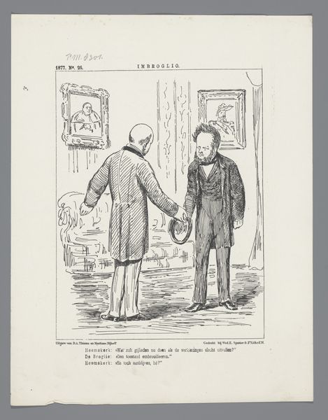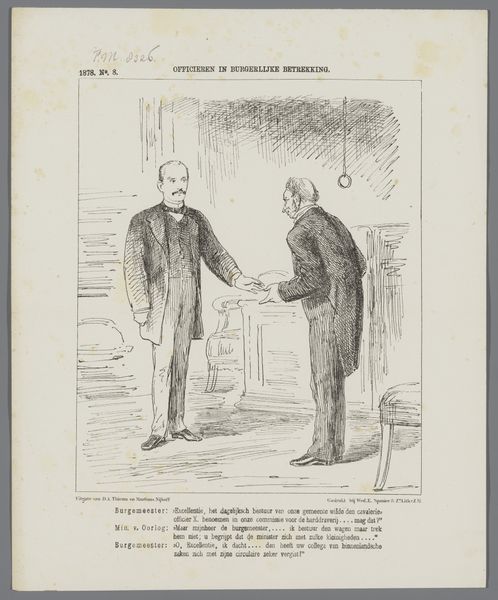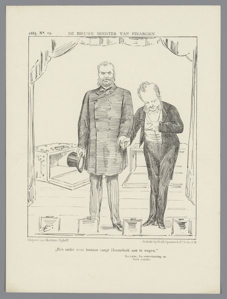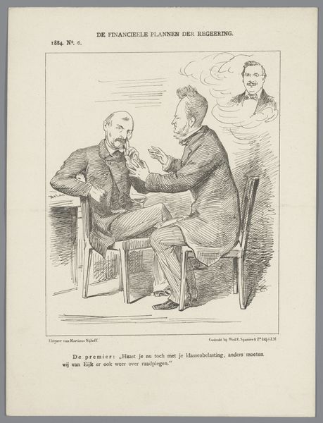 Curator: Well, this looks like a very serious business indeed, though something tells me it's meant to be humorous! Here we have "Spotprent over stemrecht, 1885" – a satirical print about voting rights dating back to 1885 by Johan Michaël Schmidt Crans. What catches your eye? Editor: All those cross-hatched lines—laborious. Look at the effort to produce this comic using just pen and print. You can feel the cost both in the artist's time, but also within the socio-political sphere it reflects. Curator: Yes, the technique speaks of its time – and it is wonderfully busy! To me it reads as both a sharp comment, and just plain fun, the way the figures are rendered... sort of earnest, but undeniably caricatured, don't you think? The fellow in the middle seems to disapprove more than agree. Editor: His oversized head gives him away. Look at that banner, though: "Stemrecht voorden gezetenwerkman." Voting rights for… seated workers? This links the act of voting with specific types of labor. Consider the political agenda embedded in the image itself through this phrase: it both excludes, but simultaneously elevates certain trades or individuals. Curator: Absolutely, you know it gives me an impression of some behind-the-scenes shenanigans. Three fellows putting their heads—and hands—together over a decree, and what that implies about power and who gets to wield it. Maybe this act—or pact—is shady. What do you feel about that quote below? Editor: “Ich sei...In eurem Bunde der Dritte," – "I am the third in your alliance". It suggests this new power arrangement excludes others. And those three dots after the character’s name? Whoever he is, his name is being suppressed, so this character may have been intended to evoke another prominent political figure at that time. The medium helps to immortalize a temporal concept with lasting effect. Curator: And isn’t it remarkable that with just ink, paper, and a clever hand, Crans captured so much about the political climate. I am reminded of Daumier, who wielded his lithographic crayon to change history...I wish I knew the whole backstory there to this image’s reception back in the day. Editor: Yes! Its directness remains affecting precisely because of the immediacy born from the medium, but it's more than just skillful satire...it's social commentary crafted meticulously through deliberate material engagement. It is always essential to assess the image within the production methods of its day, it’s time, to interpret the message more fully.