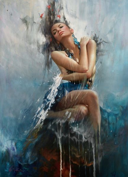Curator: What a captivating piece! This is "Awakening," an oil painting created by Michael Cheval in 2021. Its immediately striking. It feels both calming and chaotic, a real visual paradox. Editor: Absolutely. My eyes are drawn to the materiality here: the texture he's achieved with oil paint to mimic the water's turbulence versus the almost fluid draping of the cloth…it's quite masterful. Curator: Cheval's surrealist style certainly lends itself to this juxtaposition. You see a nude woman, almost floating amidst a stormy sea, wrapped in golden fabric. In the reflection of the water, there's what looks like a sunken ship mirrored from above. It gives the scene such a mythic quality. Editor: Yes, and I find myself considering the social implications. The sunken ship beneath a calm, if naked, woman seems rife with colonial allegory: those beautiful draperies obtained perhaps at great cost. The relationship to water and commerce makes the piece very layered. Curator: I interpret it more as a reflection on internal versus external states. She looks so peaceful despite the turmoil surrounding her. Perhaps it reflects on the artist's position in society too, creating beauty amidst, if you will, societal wreckage. Cheval often deals with such binaries. How the image reflects on art markets too… food for thought! Editor: Fair point, I’m just deeply invested in how that fabric has been manufactured. You see the details, so clearly depicted and it calls for us to remember the hands and conditions that make up such luxury. Curator: I can see your point, but it’s equally about the grand art historical traditions he’s playing with, too. A surrealist revisiting Romanticism’s fascination with sublime nature. Its quite loaded within an art market that perhaps privileges individual authorship above all else. Editor: I’m glad you reminded us that. These dialogues—between materiality and the museum wall, between process and politics—allow the viewer a more rich insight of the artistic creation as an end point that started in many places. Curator: Indeed. It makes “Awakening” more than just an image but an unfolding conversation.