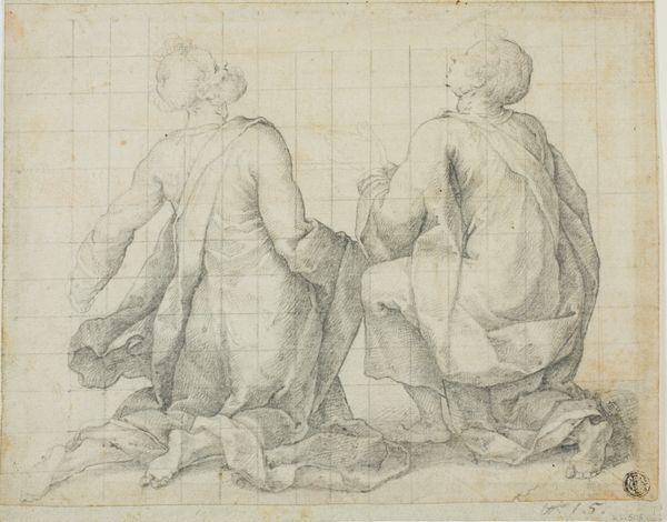 Curator: Here we have Pierre Hubert Subleyras's "Two Studies of a Man with a Cane," a red chalk drawing held at the Harvard Art Museums. Editor: It feels like a fleeting thought, like a memory sketched in the air. It’s sparse but really affecting. Curator: The composition features two distinct poses. Notice how the seated figure on the left creates a pyramidal structure with the drapery. Editor: And the cane in the second study almost seems to stand in for a missing companion. I wonder about the story. Curator: The cross-hatching defines volume, doesn't it? This work really shows us Subleyras' mastery of form and his interest in classical ideals. Editor: Absolutely. I keep coming back to the sensitivity in the lines. It’s more than just a study; it's about the fragile human condition, I think. Curator: Yes, each stroke carries a delicate precision, perfectly balanced. Editor: I'll carry that fragility with me.