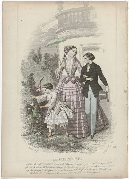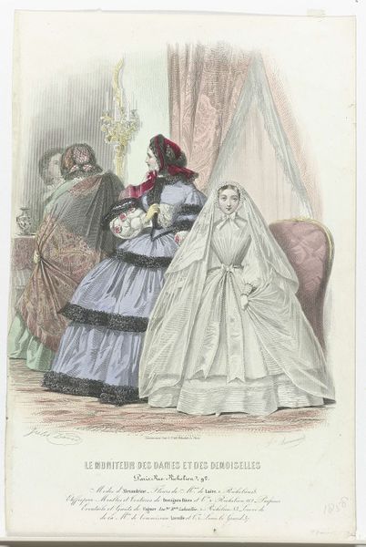 Editor: This print, "Magasin des Demoiselles, 25 avril 1852," from 1852 by J. Desjardins, made using colored pencil, portrays a moment between women, seemingly within a shop or a domestic space. The detailed dresses catch my eye, especially how they define each woman's social standing. What can you tell me about the story this image tells through the materials depicted? Curator: What strikes me is the meticulous rendering of the fabrics. The texture and detail achieved through colored pencil and printmaking suggest a culture deeply invested in the production and consumption of textiles. Notice the layered lace, the sheen of the silk, and the crispness of the cotton. Each fabric implies a distinct set of labor practices, from the cultivation of raw materials to the skilled hands of artisans. Editor: So, it's less about the narrative and more about the work that goes into making these materials? Curator: Precisely. Consider how fashion plates like these circulated widely, fueling demand and shaping desires. The "Magasin des Demoiselles" wasn’t just representing fashion, it was participating in the industrial machinery that produced it. Think about the social stratification implied by who could afford such garments, and the unseen labor that sustained their production. Editor: That's fascinating! I never considered the print itself as part of the machinery of consumption. It changes my perception of what this image is communicating. Curator: Indeed. By focusing on the material aspects, we unravel the complex web of production, consumption, and social hierarchy that defines this era. Editor: Thank you! Looking at the details really helped reveal so much hidden in plain sight about the social and economic conditions. Curator: My pleasure!