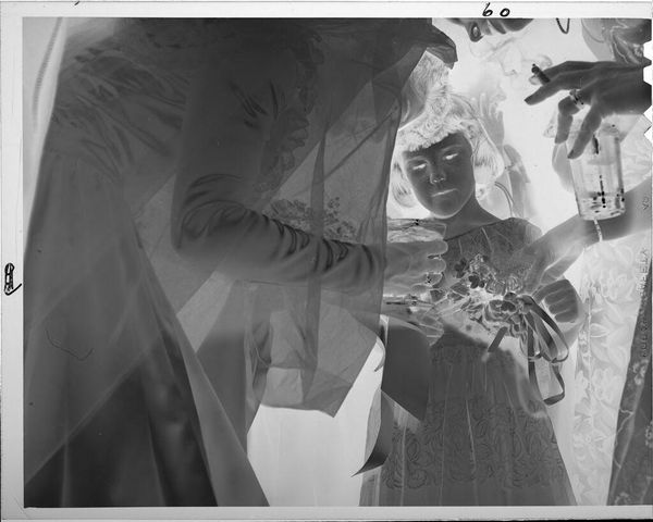 Curator: Martin Schweig’s small, untitled photograph captures an odd moment: two women dressed in playful costumes sitting on the floor, drinking from baby bottles. What strikes you first about this image? Editor: The stark contrast and shallow depth of field create a voyeuristic atmosphere. It feels less like a party and more like a staged performance, a commentary on societal roles perhaps. Curator: Indeed! The choice of costumes and the act of drinking from baby bottles throws the concept of adulthood into question. I sense humor laced with a touch of melancholy. Editor: The materiality is interesting too. It looks like a silver gelatin print, judging by the contrast. The imperfections in the photographic process underscore the constructed nature of the scene. Curator: I agree. And the framing—the cropped figures at the edges—adds a layer of intrigue. This frozen instant leaves me contemplating what is expected of women and how they find ways to subvert it. Editor: Well, it’s certainly given me pause to consider the performative nature of social gatherings and the artist's hand in creating this peculiar tableau.