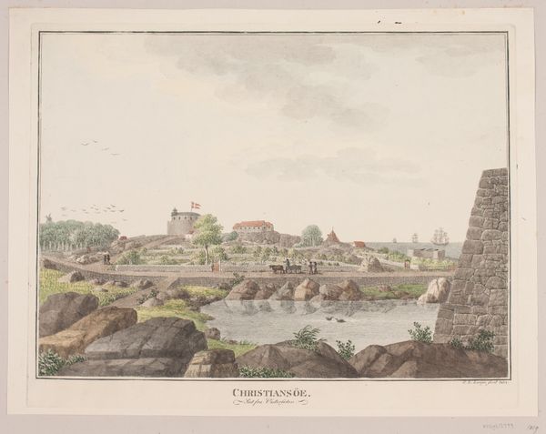 Curator: Immediately striking, isn’t it? There's a certain delicate stillness in this image. The cool tones create a placid atmosphere. Editor: This is a print – specifically an etching with watercolor – entitled *Christiansø. Sydhavnen*. It comes to us from 1819, crafted by Søren L. Lange, now residing in the collection of the SMK, the National Gallery of Denmark. What fascinates me most about this piece is the story it tells about Danish Romanticism and the renewed interest in nationhood following the Napoleonic Wars. Curator: The Romantic spirit is palpable in Lange's composition. Observe how the cityscape unfolds gradually, almost shyly. The rigid architecture is softened by light. Editor: It’s vital to consider Christiansø's strategic importance. Situated in the Baltic Sea, the island served as a crucial naval base. Lange's depiction naturalizes military presence, imbuing it with a picturesque sensibility suitable for public consumption and, one could argue, reinforcing national pride. Curator: Agreed. Notice the formal interplay: the low horizon line which emphasizes the expansive sky. It mirrors the human figures in the foreground, all contributing to the composition's sense of balance. The light almost unifies every single object depicted. Editor: The figures are rendered with considerable attention to detail. Note their attire. They speak to a particular social stratum witnessing a burgeoning Danish national identity at a pivotal moment. The dog adds a charming genre element and probably attracts the attention of contemporary middle-class spectators, contributing to the picture’s broader appeal. Curator: This seemingly simple picture is a sophisticated meditation on the era. Editor: A beautiful and insightful summation. And I might add a clear demonstration of how landscapes often carry more than meets the eye.