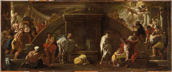 Curator: Here, we are presented with Nicolas Poussin's “The Testament of Eudamidas,” an oil painting dating back to between 1644 and 1648. Editor: Oh, this is intense! A pallid figure laid out on a bed, like a final farewell frozen in time. So dramatic. Curator: The drama emerges from the artist’s precise compositional arrangement and the figures' engagement with the central scene, highlighting Poussin's mastery of narrative. Notice the architectural rigidity and muted tonality, contributing to an overarching feeling of solemnity. Editor: Exactly, solemn is spot on! But there’s also a subtle warmth – see how the ochre hues in the drapery try to fight the gloom. Someone's scripting all of this with such focus—they really want to capture the gravity of this moment, huh? Curator: It embodies Poussin’s refined classical style. Every gesture, every fold of fabric seems carefully orchestrated to convey both narrative detail and emotional gravitas. There is very little left to chance, as it is very planned out. Editor: I find that planning quite beautiful though. It’s as though even in death, Eudamidas is still orchestrating events, taking care of those he leaves behind. Poussin captured that control. Even now Eudamidas writes, in death he leaves a great life legacy. Curator: This work, within its historical context, epitomizes the Baroque aesthetic by showcasing its blend of intellectual rigor and dramatic display, typical of history painting during the period. Its impact resides in a structured composition married with deep emotive qualities. Editor: I guess when I look at this work I feel touched and maybe moved a bit by Eudamidas's heart and love towards his loved ones, or friends. Which ultimately proves as a beautiful way of saying goodbye. Curator: Yes indeed, its artistic construction serves well.