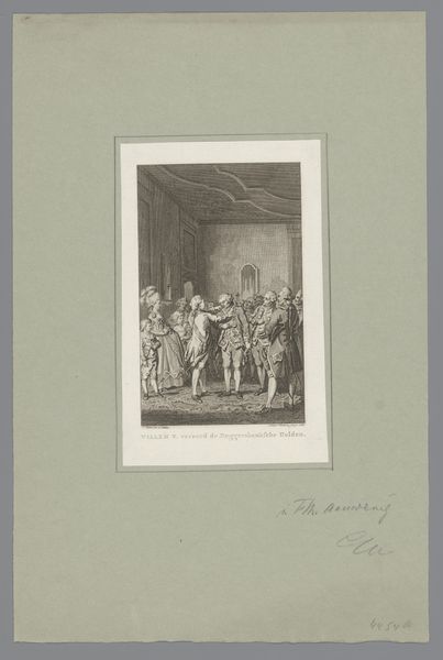 Curator: Here we have Auguste Raffet's "Mannen met hoeden met nummers er op, links kussende man en vrouw," a lithograph dating from 1828, currently held at the Rijksmuseum. Editor: It's quite chaotic, isn’t it? The energy is palpable, but the composition feels… disjointed. Curator: Well, let's consider the material and the means of production. This lithograph, rendered in ink on paper, was likely produced for a wide audience. Raffet aimed to capture a street scene, perhaps conveying social commentary on public behavior. The medium allows for mass distribution. Editor: That makes sense when we consider the perspective. But consider how Raffet employs hatching to create depth. The light seems to come from multiple sources, adding to the sense of unrest. The figures with their numbered hats create a strange, disorienting effect in the background, especially in contrast with the amorous couple. Curator: Absolutely, those numbered hats might denote military conscripts or some other form of state control, suggesting a society regulated by strict order imposed on private behaviour.. And this idea reinforces what may well have been common in a booming nineteenth-century city when an ordered, well-regulated community were the foundation of social stability and economic success. Editor: A useful social perspective, but back to form: notice how Raffet guides our eye through the scene. The repetition of shapes draws the viewers focus from the drunk, towards the happy couple and onwards to the numbered men in the crowd, giving the whole an exciting depth! Curator: By considering the relationship between the state, everyday people, and how new mechanical forms like the lithograph, we can further appreciate what Raffet set out to depict. Editor: An engaging tension is the cornerstone to what makes this piece a worthy entry to 19th Century works and styles. Its conflicting messages make it a great subject of interpretation!