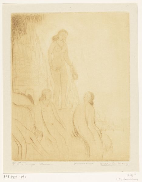 Wilhelm Lehmbruck created this etching, "Liggende man en staande vrouw," depicting a reclining man and a standing woman. Lehmbruck’s work emerged in the early 20th century, a period of immense social and political upheaval in Europe. This was a time when traditional gender roles were being questioned, amidst the rise of feminist movements and changing societal expectations. The figures are rendered with a delicate touch, yet there's a palpable sense of emotional distance between them. The woman stands tall, almost as if guarding the vulnerable, reclining man. The conventional power dynamic, where men are depicted as strong and women as passive, is subverted. Lehmbruck served as a medical orderly during World War I, an experience that deeply affected him and influenced his art. His experiences undoubtedly shaped his perception of masculinity and vulnerability, which he articulated by exploring the psychological dimensions of his subjects. This etching invites us to reflect on how societal expectations of gender and power are manifested and challenged in art. It also subtly compels us to contemplate the emotional landscape of human relationships.