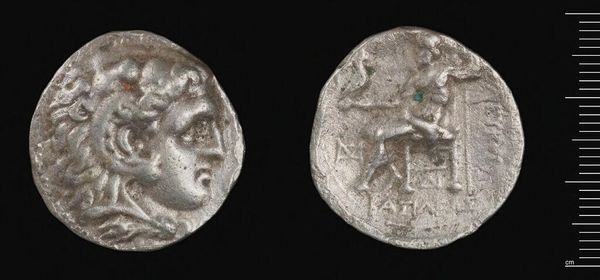 Editor: Here we have a Tetradrachm of the Chalkidian League, from Olynthos. It has such a tactile quality in these images, with the silver appearing soft and worn. What do you notice about its composition? Curator: The coin presents a compelling study in duality. Observe the obverse: a youthful, idealized head in profile. Note the laurel wreath; a symbol of victory and status. The reverse features a carefully depicted lyre. Editor: So the artist is using visual symbols to convey meaning? Curator: Precisely. The contrast between the head and the lyre is of significant interest. One representing leadership, the other, the arts. Editor: I see now how the artist uses iconography to speak to the values of this civilization. Curator: Indeed, by analyzing the formal elements, we gain insight into the values of the Chalkidian League.