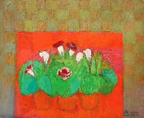 Editor: This painting is titled "Tulips," made with acrylics and impasto. It looks pretty expressive! All that visible brushwork and bright color give it a very immediate feeling. What strikes you when you see this piece? Curator: Well, first, consider the materiality. The thick application of acrylic, that impasto you mentioned, isn't just about aesthetics. It’s about the physical act of painting, the labor involved in layering that paint onto the canvas. How does that materiality change our perception? Editor: It makes it feel less…precious? Like you can see the effort that went into it, rather than it just appearing effortlessly beautiful. Curator: Precisely. And consider that this is a still life, a traditionally bourgeois subject. By emphasizing the "craft" aspect through visible labor, Serwatka arguably subverts those traditional class boundaries embedded in art production. What are your thoughts on that border that frames the image within the piece itself? Editor: I see! That border seems a little… handmade as well, or at least not uniformly printed, like fabric instead of machine. Curator: Exactly. It adds another layer of 'making' to the object and calls into question notions of high art versus craft. Notice how that "handmade" touch disrupts the artifice, bringing attention to the physical creation of this object we are considering. What’s the significance of portraying natural elements through such manufactured materials? Editor: I never considered how connected materials could be to social critique! I initially looked at this as just some flowers, but now, seeing it as a conscious commentary on labor and value shifts my whole understanding. Curator: It all comes down to looking closely at how art is made, from the initial concept down to the final brushstroke. Understanding the processes and materials opens up so many avenues of interpretation.