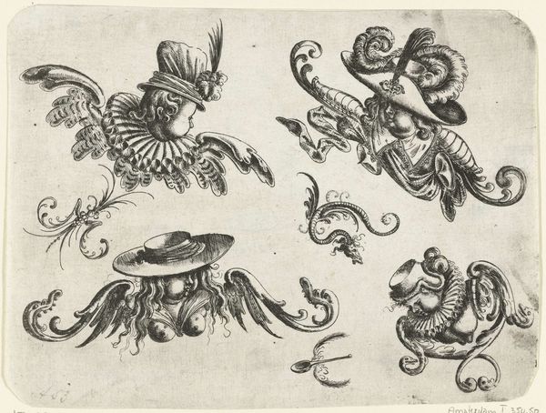 Curator: Welcome! Let's spend a few minutes with "Ornament Panels with Birds: Plate 8" crafted in 1617 by Adrian Muntink. It's currently residing here at the Art Institute of Chicago, a jewel done with engraving and etching on paper. Editor: What strikes me immediately is the busyness! It's teeming with birds, scrolls, even a snail! It's a celebration of natural forms, but filtered through such an elaborate, almost frenetic sensibility. What do you make of it? Curator: Absolutely! This type of engraving served primarily as a template. Wealthy patrons would hire artisans, who then might pull designs directly from prints like these. There’s this inherent practicality melded with decorative aspiration. See how the birds are poised? Each one carefully outlined and rendered with delicate lines; Muntink captured them as symbols, more than creatures. Editor: Symbols of what, do you think? Is this merely decorative, or could there be layers of meaning beneath? The parrot with the leaves…that has to mean something. The snail as well? Curator: Well, birds have a longstanding symbolic presence in art—freedom, the soul, messengers between heaven and earth. Here, though, presented on an "ornament panel," I read it less as pointed allegory and more as aspiration to cultivate natural harmony and elegance. This wasn't necessarily art for art's sake. Editor: But what of the parrot? Or that solitary snail below? To me, the parrot signifies awareness, perhaps imitation. In Christian symbolism, snails are linked to resurrection. This print suggests a journey towards illumination or transformation. It presents as so perfectly self-contained and symbolic, it couldn't simply exist without cultural memory informing these decisions. Curator: Fascinating point. Now that I consider that connection… perhaps the “busyness” evokes a sensory garden, cultivated by patrons for their spiritual well-being? It's beautiful how the mundane and sublime can become partners. Thank you. Editor: A small collection of avian ornament transforms into an entire world. Beautiful, isn't it?