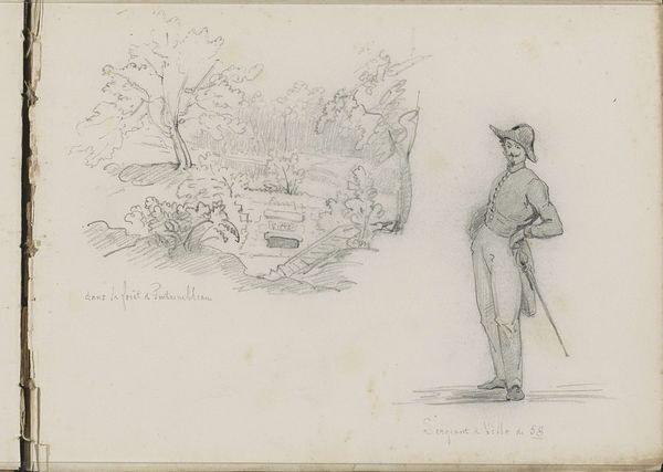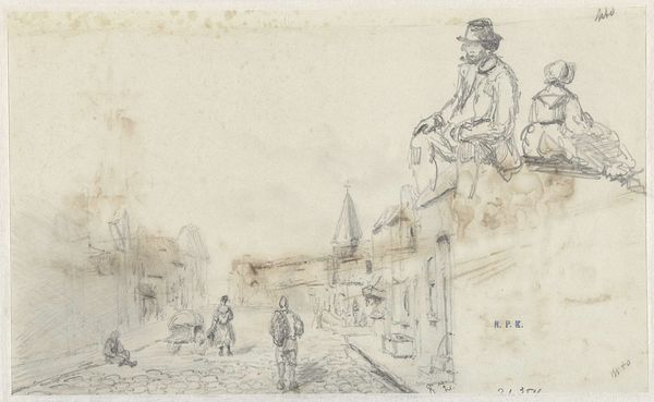 Editor: So this is Wilhelm Marstrand’s "Maleren P.C. Skovgaard og litografen A. Kittendorff, begge tegnende; samt rids af en italiensk landejendom", created in 1869, a pencil drawing on paper. It's quite informal and intimate, like a snapshot from an artist's sketchbook. What stands out to you in this image? Curator: The immediate thing that captures my attention is how Marstrand portrays the act of artistic creation itself. Note the inclusion of two artists, Skovgaard and Kittendorff, in the act of drawing. In what ways do their poses—one standing, one seated—symbolize different approaches to engaging with the landscape and the creative process? Editor: That’s a good point. One is actively engaging, and the other more passively receiving inspiration. But what does the Italian landscape sketch add to our understanding of the depicted artists? Curator: Precisely! The Italian landscape adds a layer of romanticism, linking these Danish artists to the wellspring of classical artistic tradition and a search for beauty. The Italian setting signifies not just a physical place, but an idea—the pursuit of artistic ideals. Does that reading resonate for you? Editor: It does, but I was also struck by the plainness of the line work; there's no idealizing going on here. It feels like a very honest rendering of these artists and their process, almost devoid of pretense. Curator: Exactly, we can notice how the visible lines offer glimpses of figures engaged in art, which symbolizes an authentic devotion. Can you observe how they integrate symbolic dimensions into an observed reality? Editor: Yes! Seeing the sketch within a sketchbook lets us appreciate a window into their world. It's like peeking behind the curtain. Curator: Indeed. We gain a rich understanding of both the setting and artistic process from such simple sketches. Editor: Absolutely! It enriches my perspective when observing a master artwork with insight on details.