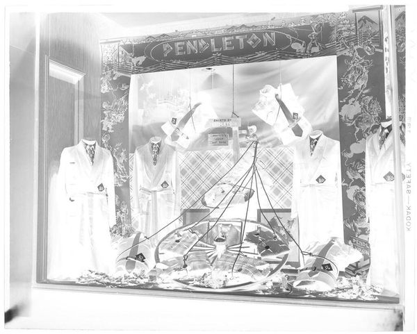 Curator: This is John Deusing's black and white photograph, "Untitled (storefront window, menswear, Schaffner & Marx)" from the Harvard Art Museums. It measures roughly 4 by 5 inches. Editor: My first thought is how staged and almost dreamlike the window display feels. The mannequins are like silent guardians of an era. Curator: Indeed. The photograph freezes a moment of idealized masculinity, reflecting the post-war aspirations marketed by Schaffner & Marx, a prominent menswear brand. The window is like a theater. Editor: The symbolism here is interesting. The suits, hats, even the miniature bridge—they all seem to be signifiers of upward mobility and the American dream. Notice the almost shrine-like arrangement. Curator: Precisely. There's a cultural narrative being built, projecting a very specific image of success and belonging through consumerism. Each element supports this vision. Editor: I’m left thinking about how these kinds of images shaped our cultural expectations. The careful construction of such a display has lasting social impact.