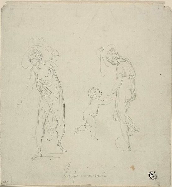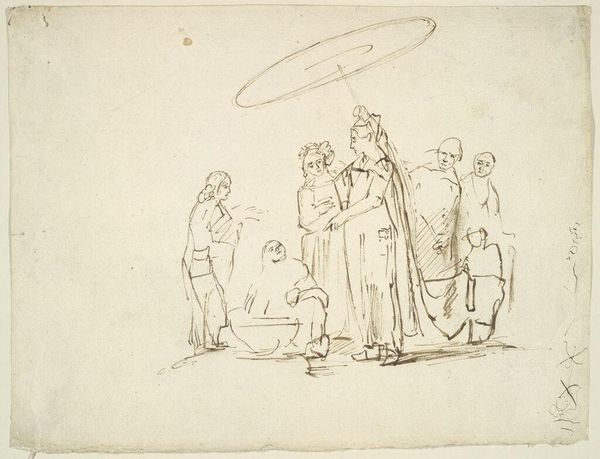 Curator: Here we have a drawing titled "Studienblatt Ein Liebespaar, die Frau zupft das letzte Blüttenblatt aus (Er liebt mich, er liebt mich nicht)", attributed to Gustav Heinrich Naeke, from the 19th century. It's an ink drawing, currently residing here at the Städel Museum. Editor: Immediately, I’m drawn to the fragility of it, almost as if the very act of sketching these figures might cause them to evaporate. Curator: That's an astute observation. The linework, quite characteristic of Romanticism, really lends itself to that ephemeral feeling. The poses evoke classical sculptures but the delicacy, the tentative touch, speaks to the era's heightened sensitivity. What else strikes you? Editor: The way he repeats the couple in different states, like frames in early animation. There's a sort of longing present, definitely a feeling that these people, and possibly the artist too, are in search of something... perhaps a reciprocated love? It makes the little flower game quite sad really. Curator: Yes, the 'he loves me, he loves me not' narrative adds an interesting layer, hinting at the precarity of courtship and the social pressures on relationships in 19th-century society. Notice the man’s attire. The detail indicates some higher standing, yet he too, seems caught in this game of chance. The repetition highlights how such anxieties permeated across social lines. Editor: And doesn’t it still? The desperation in assigning certainty to love via a daisy? It's almost absurd, or endearingly human at least. It also prompts me to consider my own expectations for what romantic fulfillment should look and feel like. It hasn’t changed much, I'm afraid. Curator: These representations reinforced social constructs around love, marriage, and gender roles. Art like this acted as both a reflection and a perpetuation of cultural norms. It becomes a source document illustrating the societal constraints individuals were navigating. Editor: I now view it a little differently; I see more tension there. It's not just gentle longing; it's the anxiety that comes from existing inside those societal restraints. So many flowers were probably harmed in pursuit of answering a scary question! Curator: It certainly reveals more than initially meets the eye. Art provides these access points into past anxieties as it is the present too, but we look through a lense today, which gives us more freedom, or perhaps other anxieties. Editor: Indeed, thank you for pulling the thorns from my flower-powered musings!