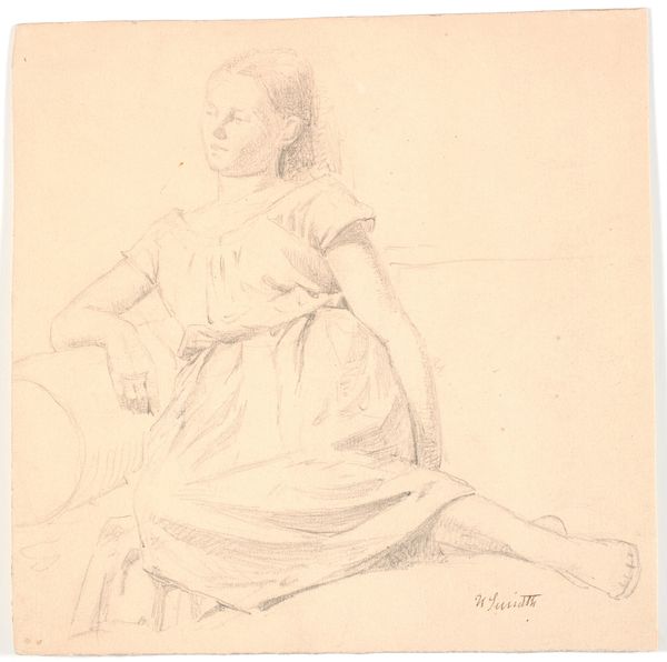 Curator: This delicate graphite drawing is titled "Sketch of a Seated Woman; verso: Sketch of a Woman" by William Valentine Schevill and is held at the Harvard Art Museums. Editor: There's a fragility here. I'm immediately drawn to the vulnerability in her posture; it's evocative of the constrained roles women faced. Curator: Indeed, the composition centers on the figure, utilizing subtle shading to define form and capture the texture of the fabric. Note the artist's attention to line and the way he suggests volume with economical strokes. Editor: I find myself wondering about the artist's gaze, and how it frames the woman's identity—or lack thereof, given her averted face. Curator: The beauty, for me, lies in the simplicity of the means, and the study of form. Editor: And for me, the power lies in how such intimate sketches reveal broader narratives of gender and representation.