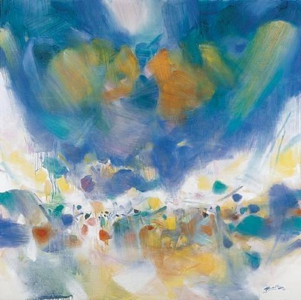 Curator: Before us is Chu Teh-Chun’s “Nuee Immatérielle,” created in 2007 using oil paint. It is a striking example of abstract expressionism. What are your initial thoughts? Editor: The canvas is a rush of color and energy; almost overwhelming. There is an immediacy and an urgency to the brushstrokes. Is this landscape dissolving before our eyes, or being born? It evokes the precarity of nature in an increasingly unstable world. Curator: It’s fascinating how Chu Teh-Chun, while rooted in traditional Chinese ink painting and calligraphy, embraced Western abstract expressionism. He moved to Paris in 1955, which, of course, had a profound influence on his style and perspective, eventually shaping the public perception of Chinese art internationally. Editor: Absolutely. But it's not simply a synthesis; it’s a negotiation. Abstraction, in his hands, isn't apolitical. It offers a space to reflect on identity and cultural displacement, reflecting his personal narrative through art. Curator: Indeed. Note the influence of artists like Nicolas de Staël, though Chu carves out his own path by merging gestural painting with elements evoking the Chinese landscape tradition. Think about how his artwork, though abstract, mirrors ideas of nature and humanity, resonating powerfully even without any representational features. The interplay of light and shadow—is it sunlight breaking through clouds, or a more metaphorical illumination? Editor: Precisely. And it’s not a passive landscape, but active. There’s a dynamic tension—struggling and thriving all at once, embodying a form of resilience, echoing our contemporary political dialogues surrounding immigration. The artwork demands that viewers situate it in the world—asking us to reckon with our own contexts and prejudices. Curator: So, beyond being an aesthetic triumph, "Nuee Immatérielle" invites reflection on the forces that shape artistic identity. Considering the political implications allows us to see it not merely as pigment on canvas but a powerful narrative shaped by broader global exchanges and historical forces. Editor: In the end, it's the potential to explore personal narratives, historical contexts, and a whole host of theoretical debates through abstraction that makes works like these feel relevant, accessible, and urgent today. The painting itself is almost an act of resistance, pushing back on prescribed meanings, defying easy consumption, and inviting us to keep looking closer.