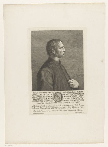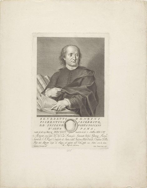 Editor: We're looking at a neoclassical engraving, "Portret van humanist Alessandro Politi" by Gaetano Vascellini, likely made somewhere between 1755 and 1805. The subject, Politi, seems keen to share the wisdom in the book he’s holding – very "here's what you need to know!" sort of energy. What catches your eye when you look at this print? Curator: Oh, he certainly does have that air, doesn't he? It’s a posture of erudition, absolutely. The careful detail, particularly in the face and the suggestion of texture in his robes, strikes me first. It whispers of that neoclassical pursuit of clarity and order. The engraver meticulously captured not just Politi's likeness but an idealized version, right? What do you make of the empty background? Editor: It puts all the focus on Politi, doesn’t it? Almost like a spotlight. Makes him feel a little isolated, maybe? Curator: Exactly! And I think that intentional emptiness reinforces his intellectual eminence. He’s standing apart, a beacon of knowledge. Neoclassicism wasn't just about recreating classical forms; it was about embodying classical ideals – reason, virtue, civic duty. Do you think the books shown symbolize this in the piece? Editor: It definitely hammers home the importance of learning and history! It's interesting how something seemingly straightforward like a portrait can carry so much...weight, I guess. Curator: Precisely! It makes me wonder: If Vascellini were to create this work today, with the cultural shifts and digital advancements we have made, what nuances might he layer into the piece? Editor: That’s a fun question! It’s made me look at this engraving in a totally new way.