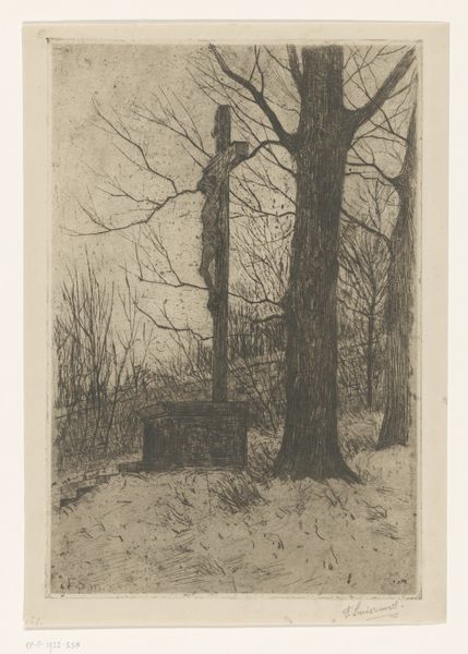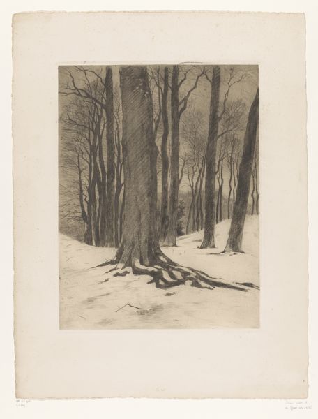 Thorvald Niss created "Skovindre. Aften" with etching on paper, a landscape now residing at the SMK. Notice how the dark, enveloping shades of the forest create an atmosphere of quietude, perhaps even a sense of the sublime. The composition is divided into distinct horizontal layers: the detailed foreground with a fallen tree, the dense, shadowy treeline, and a glimpse of a lighter horizon. Niss's use of line is particularly striking; the fine, dense hatching brings a tactile quality to the scene, especially in the rough texture of the tree bark and the forest floor. This technique creates a visual tension between the defined foreground and the obscured background, inviting contemplation on the relationship between the known and the mysterious. It prompts us to consider the boundaries of perception and representation. The deliberate obscurity also emphasizes the materiality of the print itself, reminding us that we are engaging with a constructed image, not merely a reflection of nature.