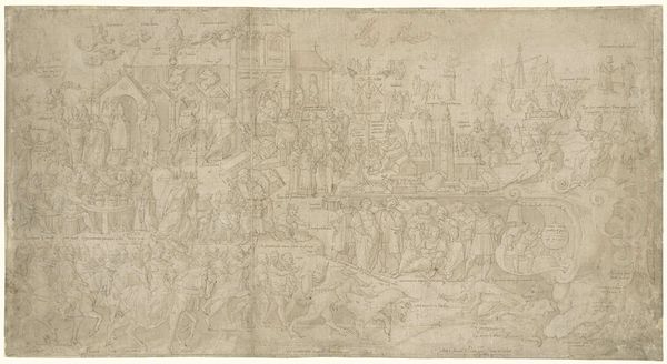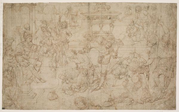 Editor: Here we have a 17th-century drawing titled "Study of Ancient Soldiers," currently residing at the Met. The red chalk really gives it a feeling of warmth, and even though it depicts soldiers, there's a sense of peace in the composition, likely due to the uniformity and symmetry of the figures. What strikes you about this piece? Curator: The choice of sanguine, or red chalk, is no accident. What emotions and ideas do you associate with the color red? It is about vitality, blood, the passions and spirit. We see in it the revival of classical ideals, an enduring quest for historical legitimacy, for greatness – notice the theatrical costumes and highly idealized forms, particularly those elaborate helmets. Do you see in them a psychological longing? Editor: I suppose I do, especially considering the artist would've lived in a vastly different world than these ancient warriors. So it’s about wanting to connect to this historical narrative? Curator: Exactly. Artists looked to the past as a means of legitimizing the present, borrowing symbols of power and authority. The horse, for instance, transcends mere transportation. What connotations does it bring to mind for you? Editor: Strength, nobility, perhaps conquest. It speaks to something deeply embedded in the collective consciousness, like a shared visual language. Curator: Precisely. And that's the beauty of iconography. It invites us to decipher these symbols, connecting us not just to the past, but to the ever-evolving story of human aspiration and remembrance. Editor: It's amazing how much meaning can be packed into a single drawing. I'll definitely be paying more attention to those repeating images now. Curator: It's an invitation to consider how we all carry visual culture within our mind's eye, which we need to question more than accept, with an open heart and an informed mind.