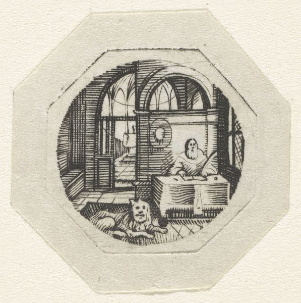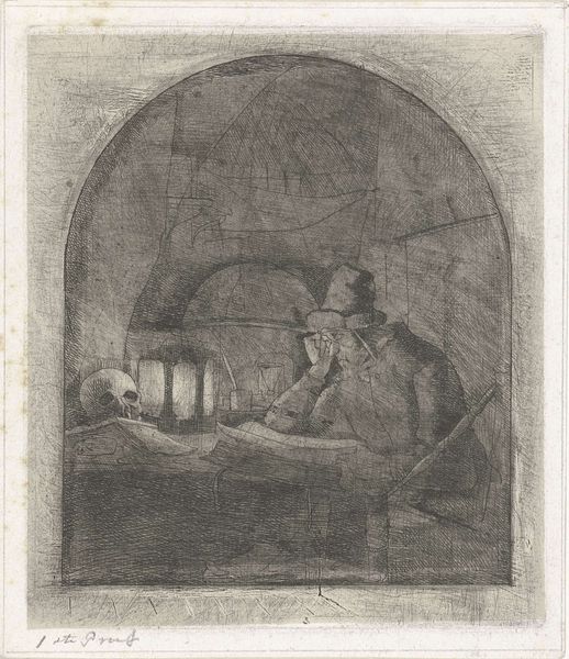 Curator: Welcome to the Rijksmuseum. Here, we have Jacobus Ludovicus Cornet's print, "Geleerde in zijn studie," likely created between 1825 and 1882. Editor: It strikes me as deeply melancholic. The pervasive shadows and the figure's posture exude a sense of isolation and introspection. Curator: Cornet utilizes etching and engraving techniques to achieve dramatic chiaroscuro. Note the deliberate arrangement of objects. Editor: The symbolic weight feels heavy- a skull juxtaposed with open books, suggesting perhaps the futility of knowledge or the omnipresence of death, especially in relation to academia and intellectual pursuits during that period. Who would depict knowledge acquisition with that macabre? Curator: Romanticism frequently employed such symbols, especially in history painting and portraiture. It is less a criticism of intellectual pursuits and more a meditation on mortality and the passage of time. Note how the composition leads the eye to the subject's weary countenance. Editor: Perhaps. I am wondering what political upheavals influenced Cornet, whether he was actively dissenting or lamenting the loss of earlier progressive victories. Or, simply to consider how anxieties about societal change informed his artistic output in general. It could have just been a portrait about someone in need of more sunshine, vitamin D and a walk outside. Curator: Your perspective allows for that, I admit. For me, I am drawn back to the artist's technical prowess in rendering texture, from the scholar's fur-lined garment to the delicate pages of the books, especially given the print medium. The execution itself becomes a form of intellectual inquiry. Editor: A valid point, because we cannot divorce skill from meaning! Thanks to these details, we have this compelling intersection of technical skill and layered symbolism, capturing a specific mood reflecting 19th-century thought and artistic practice. Curator: Indeed. This work provides ample material for continued thought, if we give it the chance to engage with it.