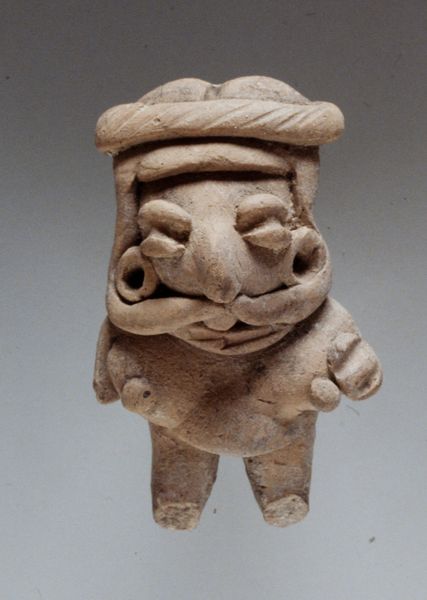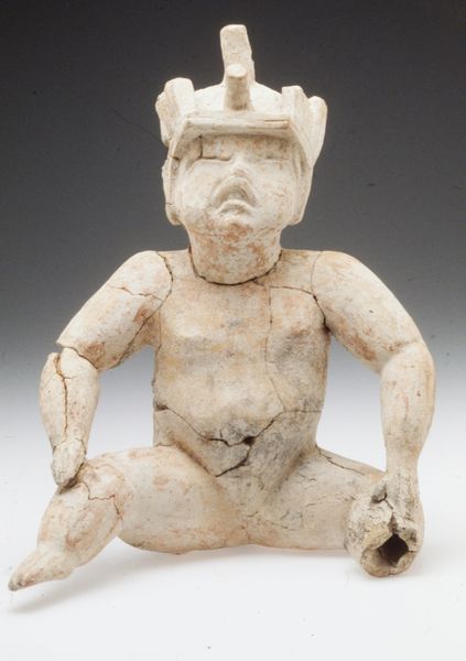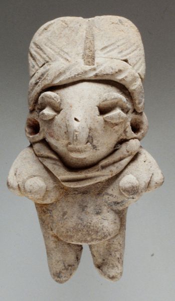 Curator: Standing before us, we have an intriguing ceramic sculpture from Veracruz, Mexico, dating possibly from 700 to 900 CE. It’s entitled “Figure of a Woman in Ceremonial Dress.” Editor: My immediate impression is one of solemnity. The figure’s direct gaze and slightly open mouth suggest a powerful presence, even though she is rendered rather stoutly. Curator: The attire certainly speaks volumes. The complex patterns adorning what seems to be her tunic are significant. It’s very possible that these are indicators of social standing and play a central role in understanding indigenous aesthetics. Editor: Absolutely. Those geometric shapes read almost like glyphs to me—symbols of identity and cultural narratives woven into the very fabric she wears, both literally and figuratively. The hat too—the projections almost look like antennae—making me wonder what deeper communication this figurine represents. Curator: Iconographically, the headgear may well symbolize a specific rank or ritual role within the community. Such markers were often carefully preserved and repeated within the art of a specific people. Editor: What strikes me is the overall effect: it projects dignity, endurance, even resilience. We have to imagine the textiles this sculpture references were vividly colored originally. Curator: Precisely! These artworks formed part of ritual performances deeply rooted in beliefs that legitimized social order and gave spiritual significance to political power. Now we are viewing it out of its intended public sphere. Editor: A poignant thought—that these cultural expressions, now safely behind glass, once pulsated with communal energy, laden with ancestral memory. She stands now as a beacon of what has come before, no longer in her native milieu. Curator: Her solemnity echoes, reflecting across a huge historical gap to prompt deeper awareness. A cultural figure divorced from her cultural history can also symbolize many things. Editor: And this singular figure, though displaced from its original location, speaks across millennia, offering a vital, if quiet, assertion of identity.