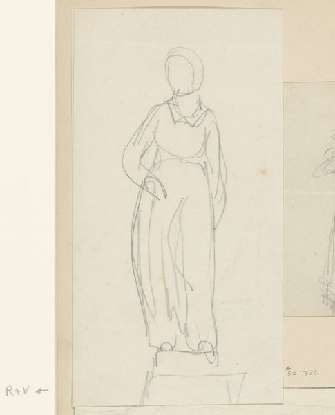 This sketch, "To kvinder," by Wilhelm Marstrand, presents two female figures rendered with swift, economical lines on paper. The drawing emphasizes form and posture over detail, inviting us to consider its structural elements. Marstrand uses line to define the contours of the women and their drapery, creating a study in contrasts. The figure on the left is grounded, with a hand confidently placed on her hip, while the other holds a vessel. The figure on the right, with arms crossed, gazes upwards. It's a composition that directs the viewer's eye along different axes. The sketch destabilizes traditional portraiture by focusing on the figures' forms and their relationship to each other. The sparseness allows the viewer to engage with the underlying structure of the composition, highlighting how line and form communicate narrative possibilities and psychological dimensions. It functions as a study in the human form and its capacity to convey expression.