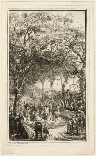 Editor: Here we have George Cruikshank's "The Masquerade Ranelagh Gardens," an etching. It looks like a chaotic scene! What can you tell me about the cultural context of masquerades in this era? Curator: Cruikshank captured a moment of social performance. Masquerades were about temporary social leveling, where identities blurred, but think about who actually had access to these spaces and how the imagery reproduced societal norms. Editor: So, the image, while seemingly egalitarian, still reflects the social hierarchies of the time? Curator: Precisely. Consider the gaze, the costuming, and the power dynamics implied by the setting itself. What do you notice about how different figures are portrayed? Editor: That's a different angle than I was expecting. It makes me rethink the intent of the artist in creating this. Curator: Exactly! Analyzing the social landscape gives us new avenues into understanding the purpose of the artwork.