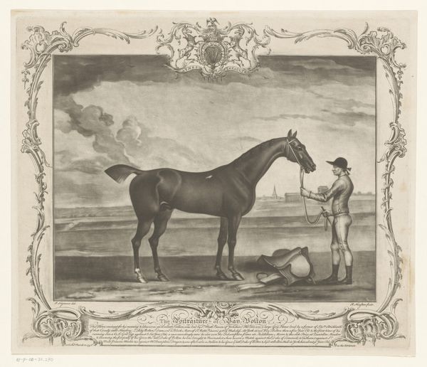 Curator: This engraving, made in 1756 by Richard Houston, is entitled "Racepaard met jockey," or "Racehorse with Jockey," in the collection of the Rijksmuseum. Editor: It strikes me immediately as a portrait meant to showcase power. The horse is centrally located, taking up most of the composition, looking so proud and poised. It almost diminishes the boy beside it. Curator: Indeed. The purpose of such portraits was less about capturing a likeness and more about asserting status. Horse racing was a sport closely linked to the aristocracy in 18th-century England, therefore depictions of these racehorses would become status symbols. Notice the rather elaborate, ornamental frame Houston created for the composition. Editor: And isn't it interesting how this print participates in constructing ideals around masculinity? The delicate lines used in the engraving seem almost paradoxical when linked to a horse depicted as robust. The youthful figure almost seems like a fashion statement; a well-dressed ornament himself! Curator: The engraving medium also served a distinct social function at the time. Printed images could circulate widely, giving a larger audience access to these status symbols, however, still primarily accessible to a more privileged strata of society who had access to purchasing prints. Editor: That makes me think about how such imagery also perpetuated existing class structures. By representing an idealized version of ownership and the good life, these works solidified and normalized those power dynamics in society. Curator: The detailed naturalistic rendering aligns with an emerging interest in the scientific classification of animals, connecting status symbols to enlightenment ideals. This artwork underscores that throughout history, seemingly benign artworks reinforce prevailing socio-economic hierarchies. Editor: Absolutely, art isn't neutral; it actively participates in shaping cultural values. Spotlighting such historical objects reveals how ingrained systems of power operate through cultural expression, which in turn asks us to interrogate similar contemporary trends.
