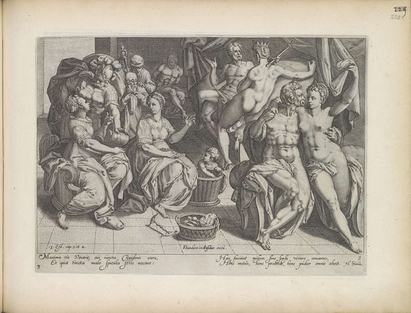 Curator: Welcome. Today, we are looking at "Bruiloftsfeest, ca. 1600", or "Wedding Feast, circa 1600," an engraving created anonymously sometime between 1600 and 1649. It resides here at the Rijksmuseum. Editor: What strikes me first is the energy, that chaotic, joyous, and slightly debauched feeling. It's as though the entire village has erupted in celebration. Curator: Indeed. Its charm is how it presents a very specific slice of life. Depictions of peasant weddings were a common subject in Northern Renaissance prints, often laden with moralizing messages about excess. The print functions as a form of social commentary, revealing details of ordinary lives, but with an intention. Editor: It's fascinating how these seemingly straightforward scenes also subtly reinforce class distinctions. Look at the way the figures are grouped: the presumably wealthier, more demurely dressed figures at the formal table contrast with the revelry spilling out into the foreground. It's almost a staged performance of societal norms. Are there implicit gender dynamics at play here? Curator: Almost certainly. The women near the serving area contrast with the tipsy and inebriated male figures on the ground. How do these scenes reaffirm established codes of conduct in this Northern Renaissance community? Editor: We might see that with more detail here. See how much activity there is? What’s the perspective the printmaker took? And what about that building structure in the background? Curator: This genre scene provides details on all types of rituals including preparing foods and drinks. Given that this artwork lacks any additional details about the artist and engraver we might question how this reflects social-cultural beliefs and practices during the Northern Renaissance. And where is this celebration happening? Editor: This reminds me that even in celebrations like weddings that can signify union and community can be a tool of oppression that reifies gendered roles in the kitchen for labor and submission. We might ask here what kind of critical interventions could be made at similar contemporary events to deconstruct this historical binary? Curator: Considering this depiction within the framework of historical representations of women offers a vital perspective. It allows us to unpack the enduring nature of social imbalances embedded in seemingly innocuous traditions, doesn’t it? Editor: Absolutely, seeing this through a contemporary lens can inform a radical reimagining of communal celebration and equity.