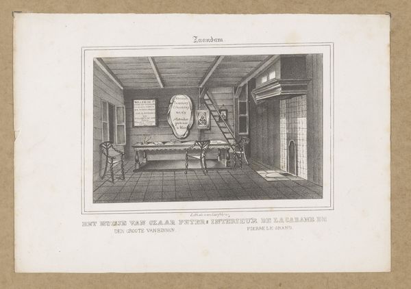 Editor: This print, titled "Interior of the Tsar Peter House in Zaandam," shows us a modest domestic interior. It's labeled as being made sometime between 1831 and 1899. The description says it's an etching. I’m immediately struck by how meticulously detailed it is, but it also feels kind of… empty and austere. What catches your eye when you look at it? Curator: You've nailed the austerity, absolutely! For me, it’s the light – that almost tangible sense of light filtering in through the windows. See how it defines the simple planes of the room? Makes it feel almost holy, like a humble stage set for some unseen drama. But consider, what is Peter doing here, in a plain wooden cottage? Editor: If I recall from history, Tsar Peter the Great lived here to learn about shipbuilding. Curator: Precisely! It's the clash of cultures. A Russian Tsar – an absolute ruler, divine right and all that – humbling himself to learn a trade. This wasn’t just about boats, was it? What do you imagine it might also tell us? Editor: Perhaps it shows a desire for modernization and practical knowledge... something beyond royal tradition. But it feels strange; almost a set piece for visitors? Curator: You’ve struck gold! The etchings would have sold well as souvenirs. Peter as a relatable, ordinary fellow – a great piece of PR, wouldn’t you say? Consider the tension between the image, and historical truth. A lot to chew on, right? Editor: Definitely! I never thought of historical documentation like this being promotional! Curator: Exactly! And I love seeing how our understanding shifts simply by noticing light and asking those “what if…” questions. The silent spaces often speak loudest.