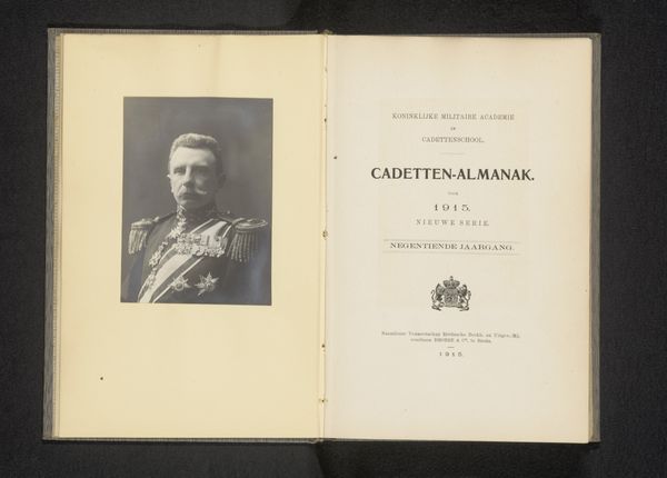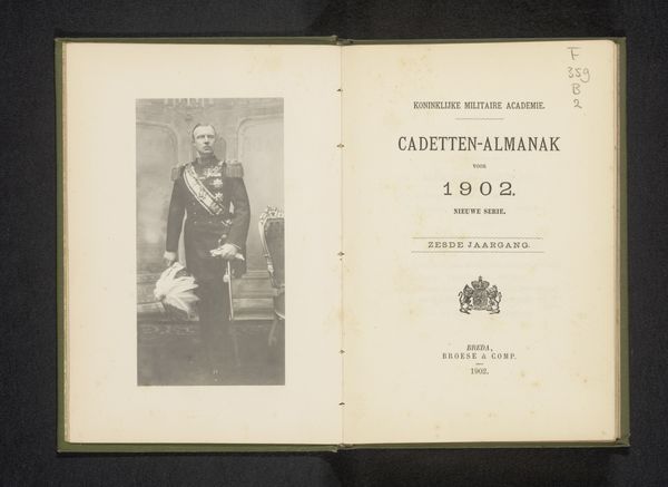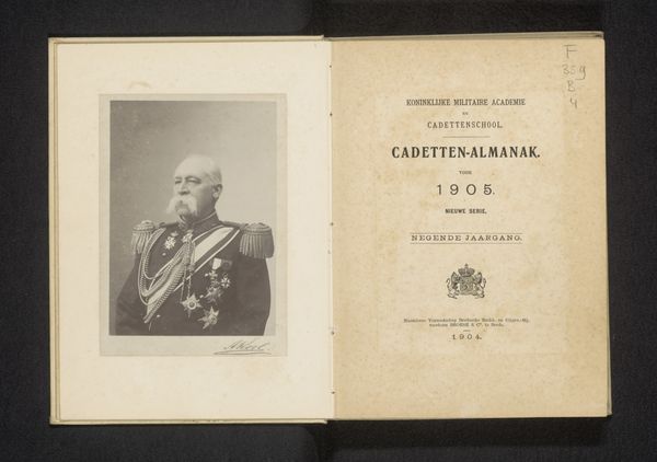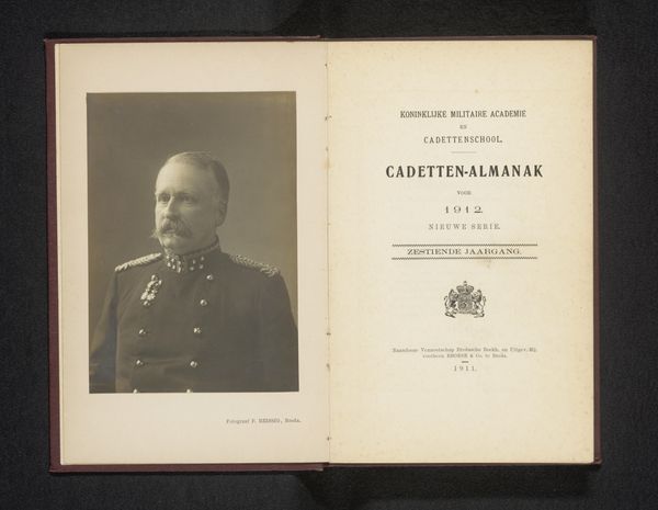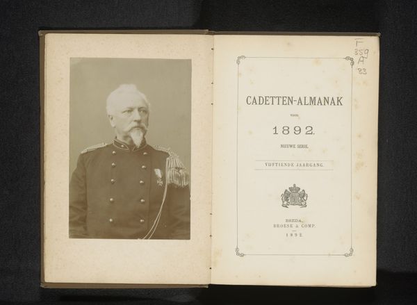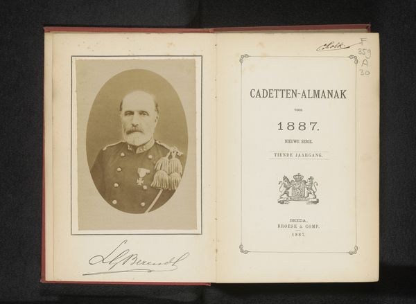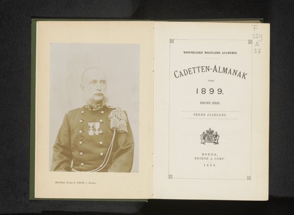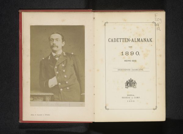 Editor: We're looking at "Portret van een onbekend lid van het bestuur van de Koninklijke Militaire Academie in Breda," taken before 1889. It's housed in the Rijksmuseum. This albumen print, tipped into a yearbook, captures a dignified officer, yet the faded sepia tone lends it a somewhat melancholic air. What do you make of this photograph, considering its historical context? Curator: This portrait offers a fascinating glimpse into the intersection of institutional power and photographic representation. Note how the photograph, initially a relatively new medium, is being used here to document and legitimize the leadership of the Koninklijke Militaire Academie. What impact does placing the image inside a yearly book, the Cadetten Almanak, have, compared to, say, placing it on a wall? Editor: That's interesting! I guess it becomes part of the institution’s documented history, accessible and circulated within the academy. More like evidence. Do you see a visual intention in the portrait or just documentation? Curator: Both elements are definitely at play here. The very act of including photographs like this contributed to the Academy’s construction of its public image, circulating ideals of duty, leadership, and national identity, but one could see it as an administrative archive with restricted access. But there's also the individual within the photograph – an 'unknown member.' How does anonymity play into the power dynamics at play? Is it meant to signal a collective rather than an individual identity? Editor: It is a good point! I hadn’t thought about anonymity in a photograph! I’ve learned that photographs don’t necessarily reflect or highlight the individuality and personal features of a character. It may reflect only the intention of power... Curator: Precisely. This work reminds us that photography has always been entangled with social, cultural, and institutional forces. And that in itself makes it even more fascinating. Editor: Absolutely! Seeing it through this lens makes me think about the power of archives and their contribution to collective identity in new ways. Thanks for illuminating the subject so brilliantly!
