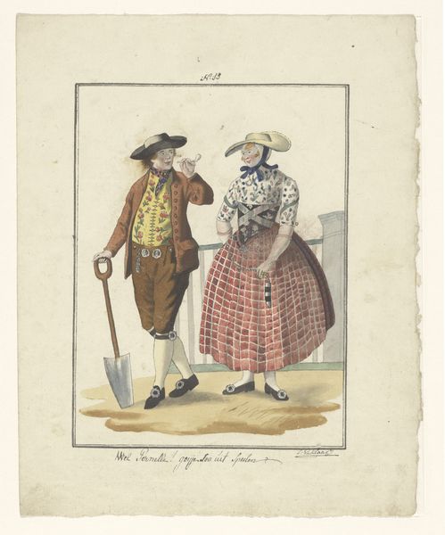Curator: Here we have "Vlaardingse visserstypen," or "Vlaardingen Fishermen Types," a watercolor made in 1816. It resides here in the Rijksmuseum. Editor: There’s a gentleness to this work; the tones are muted, and the depiction of these two figures feels remarkably tender. Is this the Netherlands? Curator: Yes, the artist is Jan Anthonie Langendijk Dzn. This work is really interesting, particularly its reflection of romanticism in its idealization of the rural figure, and genre painting in its rendering of everyday life. Editor: Interesting that you call it 'idealization.' What I find compelling is the material culture on display: The basket the man carries, seemingly woven, his pipe, and even her wooden pail. How integral would you say those crafted items are? Curator: Massively so. Part of romanticism's wider project was looking to a more innocent, arguably imagined, past. It looked at an uncomplicated present in its stead. This aesthetic movement certainly influenced how art was produced and consumed. Editor: True, and the artist pays so much attention to how things are made – how those clothes must have been sewn and worn, the cooperage on her pail. What story do these items tell about the realities of early 19th-century Dutch labor? Curator: Well, look at the work itself. Its display is at the Rijksmuseum, which suggests the artwork is more of a historical piece with institutional value than of real fisher folk culture. The depiction does capture some essence, and simultaneously abstracts it for higher class viewership. Editor: Fair point. To create the work itself—think of the craft of mixing watercolors, the specific papers used then...even those elements contributed to how these fishing community individuals would be seen through time. Curator: I agree completely! The presentation certainly refines the representation. Thinking of the material conditions allows us to critically analyze the work. Thanks for bringing these layers to my attention! Editor: Always a pleasure to peel back the artistic process with you!