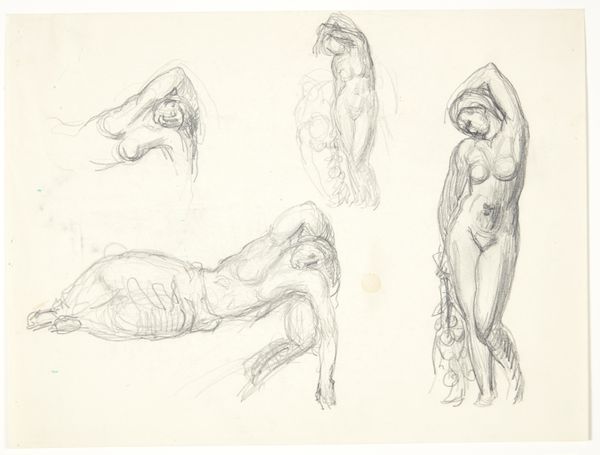 Curator: Here we see “Three Male Studies”, a pencil and charcoal drawing attributed to John Singer Sargent. What's your immediate impression? Editor: They appear quite fragile, incomplete even, rendered with a soft touch that almost makes them seem to shimmer on the page. Curator: Sargent's position within the art world often involved navigating the societal norms and artistic expectations of his time. Think about how these studies of the male nude were both a nod to classical artistic training, but also how such representations were fraught with socio-political implications related to the male body and power. Editor: Precisely, these weren’t exhibited works intended for broad consumption, I imagine. One sees the artist’s technical skill on display—the control of line, the delicate shading to convey musculature—within the historically fraught context of representing male form. It speaks of art education and training—of the artist's journey toward mastery and how such images have historically served pedagogical needs and been circulated. Curator: Absolutely. There's also the underlying question of whose gaze these bodies are intended for. Are they simply anatomical studies? Do they allude to broader narratives of masculine identity? These issues permeate so much of figuration. The softness, you mentioned at first sight—does that perhaps introduce another level of questioning, where vulnerability or fluidity comes into play, versus pure strength or dominance, in this traditional academic setting? Editor: Indeed. When considered together, one recognizes in them how societal institutions and pedagogical practices often dictate the production and the reception of images. Curator: Well, by examining these drawings, we see the subtle, complex dialogue between artistic expression and societal expectations and can come to understand them not just as academic exercises but sites of historical and social negotiation. Editor: I agree completely. A valuable window into the artist’s practice and into broader structures that support art making.