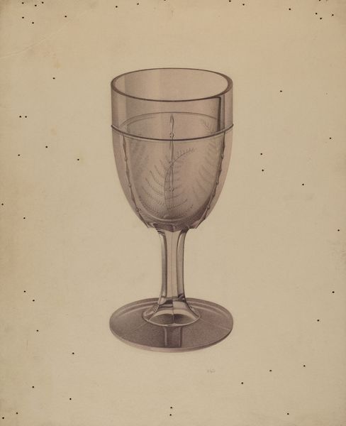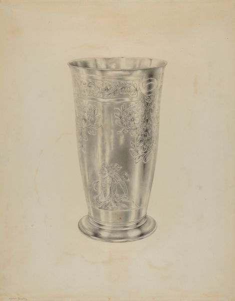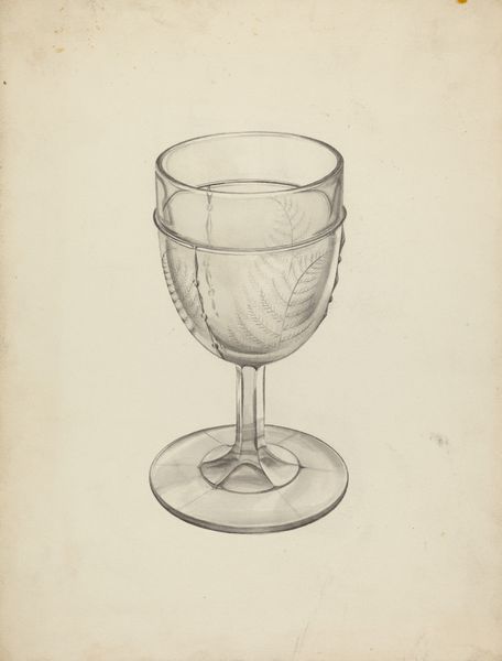 Curator: This quiet drawing immediately strikes me. There's something so peaceful in its simplicity. Editor: And yet so loaded, I think. We are looking at John Dana’s "Goblet," likely created between 1935 and 1942. A delicate rendering in pencil. Curator: Absolutely, pencil on paper. A simple enough medium to portray something so symbolic. A goblet often represents abundance, celebration, even sacrifice in some cultural contexts. The etched floral design adds another layer. Do you find it evocative? Editor: I do. I wonder what the cultural significance of the flower could be for Dana? Its prominence on a vessel meant for holding drink - what statements are being made about societal views on consumption and possibly indulgence. What was he trying to say about society? The Modernist aesthetic speaks to an era of questioning, doesn't it? Curator: I completely agree. The seemingly realistic depiction feels inherently modern because it prompts that questioning. Consider its public role as a simple, humble sketch during times when grandiose pronouncements filled public spaces. Dana gives us a small, questioning image. Editor: The lack of color certainly enforces that simplicity. We are asked to fill it ourselves, not to interpret, or be presented with one clear narrative or agenda. Even the scale enforces this, doesn't it? Its intimate, calling for closer, deeper inspection. Curator: Yes, the absence of bold color pulls you into the fine detail, urging an introspective look at something that we typically raise in moments of celebration or grief. Think of what those rituals represent. How does that apply to the life of this object, memorialized in a simple drawing? Editor: Dana's goblet becomes a historical marker of social practice, asking profound questions with soft lead. What I appreciate most is how relevant its silent probing remains today. Curator: Absolutely. It transcends its medium to challenge the core of traditions surrounding us. Editor: Indeed. An intimate sketch that prompts boundless reflection, now it is for everyone.