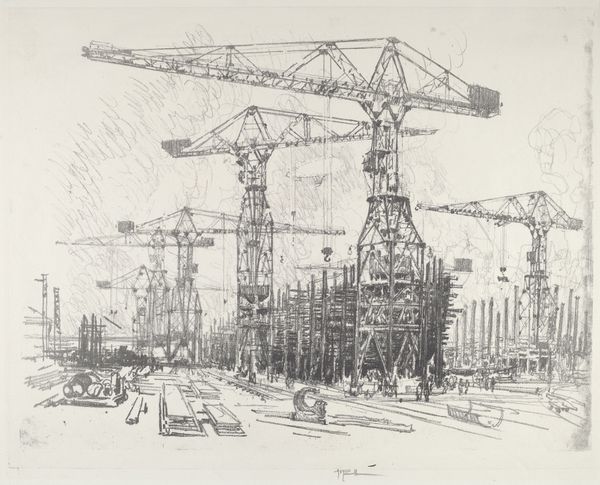 Joseph Pennell made this print, ‘The Sea Lord’s Yard,’ using etching, creating a kind of skeletal city out of lines. There's something so raw and immediate about the lines, they feel like you’re watching Pennell figure out the space in real-time. Look at how the web of lines builds up the textures of the cranes and scaffolding. Some areas are dense, almost chaotic, while others are left spare, letting the light in. The scratches and the delicate strokes, they all come together to create this really immersive sense of place, like we’re right there amidst the industry and activity of the shipyard. The way he captured the industrial landscape reminds me a little of Piranesi, but with a distinctly American flavor, a celebration of progress mixed with a touch of melancholy for what’s being lost. With Pennell, it's not about perfection, it's about the messy, dynamic process of seeing and recording.