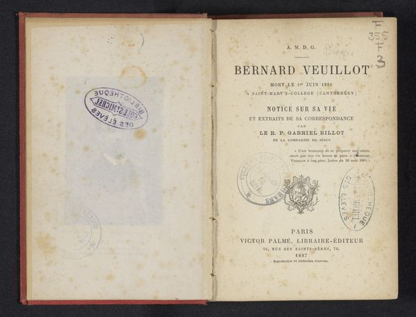 Editor: This is "Galerie C. Verlat", a print from 1880 by Mees & Co. It looks like an advertisement of sorts… maybe even a book cover? I'm immediately drawn to the aged paper and the elegant typography, giving it a very vintage feel. What catches your eye in this piece? Curator: Oh, I love that you see the ‘vintage feel’ immediately. For me, it’s the subtle narrative playing out. We have this ethereal figure in the inset image - is it an illustration or an engraving perhaps? - and then we have the very direct declaration of "Galerie C. Verlat". The contrast begs the question: What is this gallery offering? Is it beauty? History? A touch of the divine? What do *you* think? Editor: Hmm, that’s a great question. I hadn't considered it from that perspective! The "touch of the divine" aspect really makes me see the work differently. Curator: Right? It makes you wonder what secrets and artistic perspectives could be hiding behind those gallery doors. The engraver Mees & Co. is almost setting the stage, selling the ‘feeling’ as much as the gallery itself. Do you see that decorative monogram between the gallery's name and the address, the stylized ‘M’? It tells us this is a brand. Editor: Now that you point it out, it does seem intentional! Almost like they were curating their own image with as much care as the gallery itself. I’ll be sure to notice details like this in the future. Thank you! Curator: Absolutely! It’s often the little details that whisper the loudest secrets. Art invites us all in to reflect on things hidden, so keep looking and finding out about them.