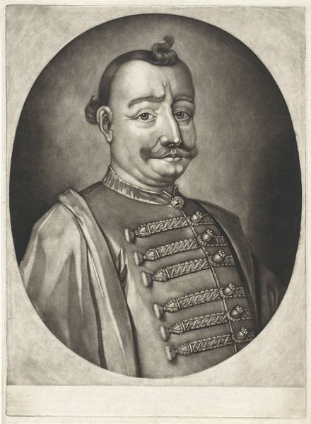 Curator: Here we have Pieter Schenk's engraving, "Portret van Jan III Sobieski, koning van Polen," created sometime between 1670 and 1713. It's part of the Rijksmuseum's collection. What are your initial thoughts on it? Editor: My first impression? It feels quite imposing, even austere. The dark shading and the king's serious expression definitely convey a sense of power and authority. The composition, contained within that oval, adds a sense of formality. Curator: Absolutely. Schenk really captures the gravitas expected of royalty at the time. Sobieski, a significant figure in Polish history, particularly known for his victory against the Ottoman Empire at the Battle of Vienna in 1683. This print likely served to propagate that heroic image. Editor: Right. The inscription below, "Ioannes III D.G. Rex Poloniae," underscores that divine right to rule. The text underneath, although partially in Dutch, clearly references his martial prowess and mentions Vienna explicitly. The image reinforces that he was, and continued to be after his death, positioned as the savior of Europe. It becomes propaganda! Curator: I see the engraving and text as reinforcing not only the king's image, but as contributing to the broader narrative surrounding Polish national identity, even today! Editor: The baroque style certainly adds to that dramatic flair. Look at the intricate detailing on his armor! I find myself thinking about accessibility, though. This being a print, how widely circulated would images like this be at the time? Who was the intended audience? Curator: Fair point! Prints, while more accessible than painted portraits, would still largely circulate among the educated elite and those within the political sphere. Though, in truth, through copies and re-prints, some aspects could trickle down. I agree that the use of text and image combined creates a potent message regardless of class. Editor: Indeed, it shows us how constructed these visual representations of power are. It’s a calculated projection of strength, solidified through artistry. I’m always so fascinated when such images persist centuries later. Curator: Precisely. It leaves me wondering, how do contemporary societies perpetuate power in this way, even now? The print has an artistic quality to be certain, but it offers a strong argument of carefully maintained political imagery.